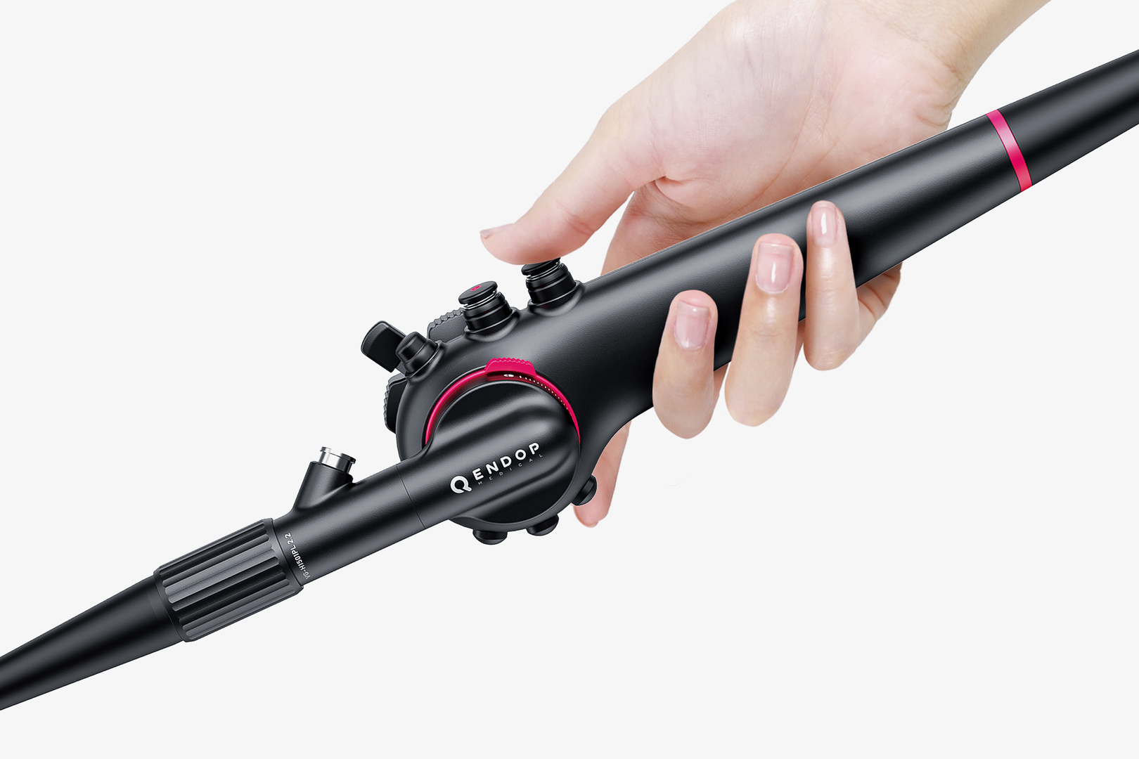 Qendop is a lightweight gastrointestinal endoscope with a natural transverse grip that is more comfortable for female physicians to use over time. It has a first-of-its-kind rotatable endoscope catheter that allows the user to adjust the angle of the catheter within a specific range (0 to 30°) and lock the angle with the red angle locking ring.