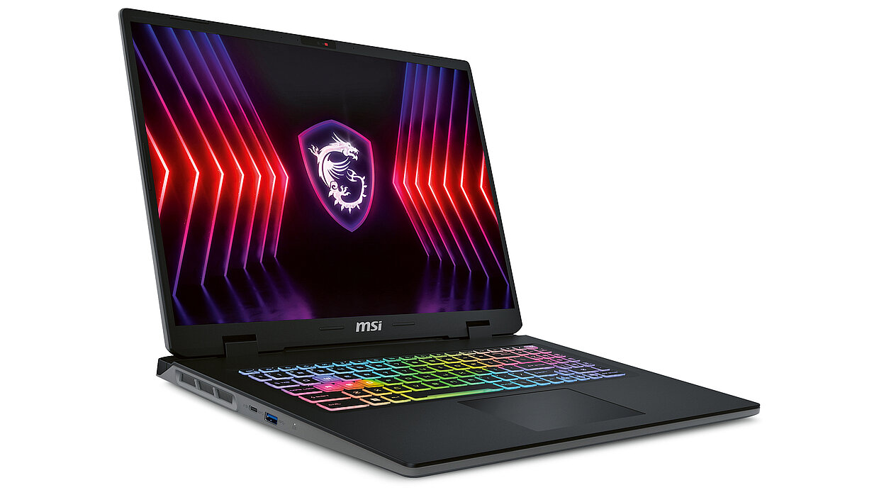 A gaming laptop that is somewhat more subtle than similar products is the Raider 18 HX. Although the device is still recognisable as a gaming laptop, the RGB light strip and the illuminated logo are comparatively slim, making it suitable for other uses, such as school or work. This is also indicated by the lower weight compared to the predecessor model, which was slightly thicker. In addition to the revised light strip, the underside of the case has also been redesigned with some symmetrical accents.