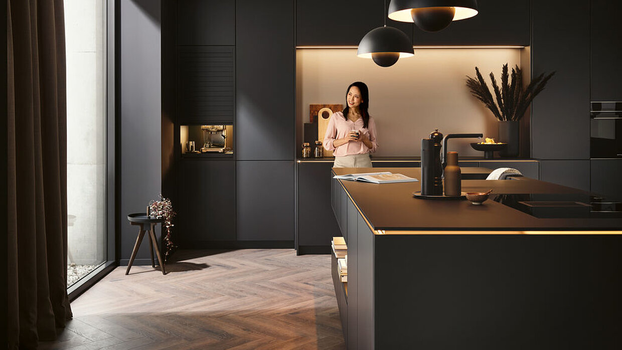 Inspired by raw industrial aesthetics, the surfaces of RAUVISIO cube feature the cool visual appeal and irregular texture of concrete. With their natural air pores and individually unique surface structure, the panels make a bold statement in any room. A matching edgeband is incorporated to create the appearance of a solid concrete slab. The matt finish obscures fingerprints and smudges so that nothing diminishes the elegant overall impression. The sturdy material can also be processed with standard woodworking tools.