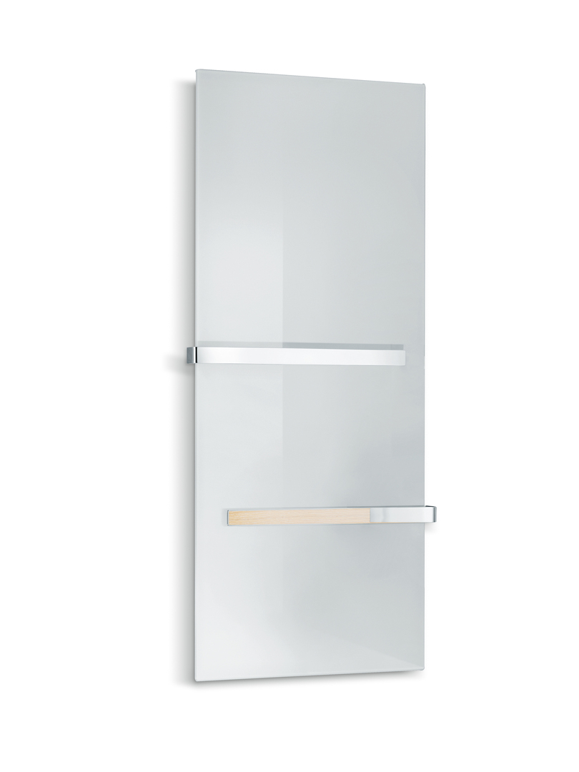 With its clear form and smooth surfaces, Retango boasts an elegant appearance. The flat body of the radiator seems to float on the wall and blends seamlessly into bathroom interiors. Silver-coloured towel rails can be attached to the front as an option. A dual-heating technology ensures safe operation: the surface behind the towels emits a lower temperature than the upper area of the radiator. Room temperature and heating times are set via a digital remote control.