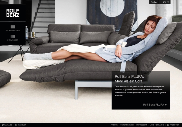With large-scale, emotive images, the corporate website presents the brand and product world of Rolf Benz after its relaunch. To follow the path of rejuvenation and create modern style environments, the brand consciously turns away from the classic past. Looking for inspiration for their own apartment, users can browse Rolf Benz’s “Wohnwelten” (Worlds of Interiors) or look through the newly developed e-zine “Lesestoff” (Reading). Intuitive product navigation leads them directly to the selected furniture piece.