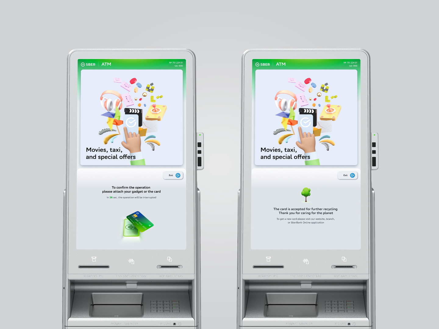 The user interface for Sberbank ATMs was revised to motivate customers to switch to contactless operation. The user interface features an intuitive design with colourful micro-animations and personal prompts to avoid operating errors. Also, a biometric login and voice control were implemented. In addition, as the processes for obtaining a service have been simplified, the time spent at the machine is reduced. Moreover, when the plastic card expires, users can dispose of it at the ATM for recycling.
