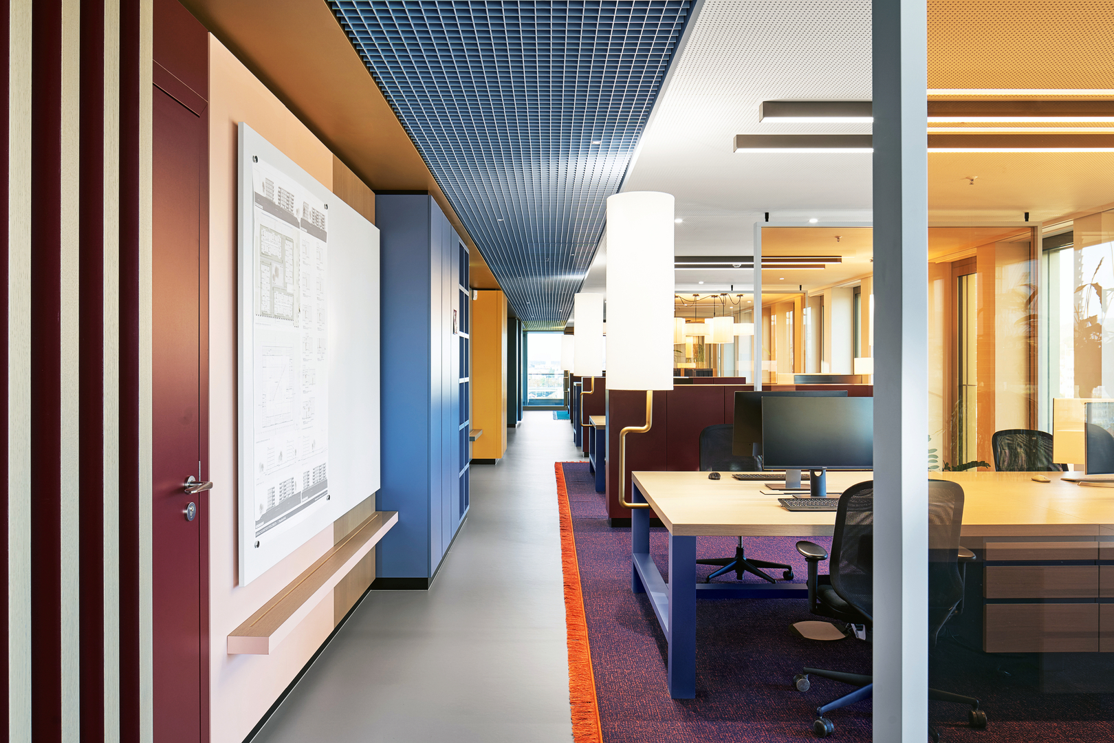 This interior design for the Schöller SI company aims to reflect the values of the construction project developer, whose core business is not just commercial but primarily residential estates. The office rooms are intended to offer a contemporary work environment. Special emphasis was placed on promoting values such as co-working, collaboration and communication. For this reason, both open and intimate spaces were designed which support different work situations. The use of warm colours, a carefully chosen mix of materials as well as lush green areas add to creating a pleasant indoor environment.