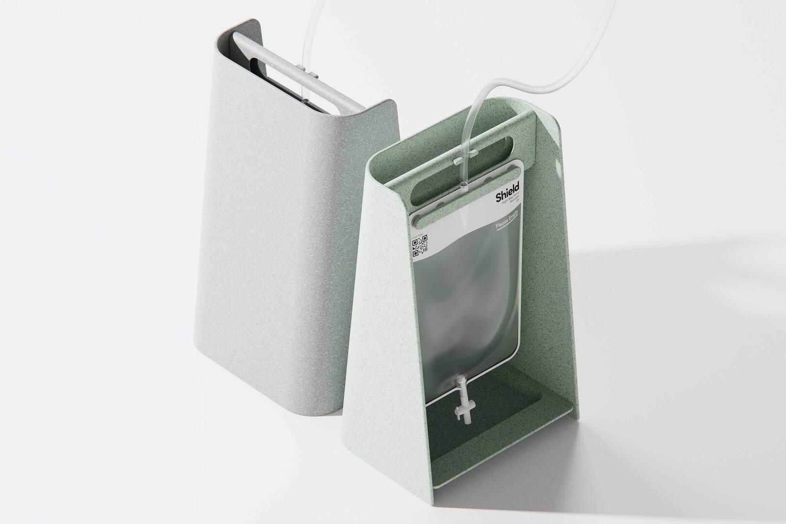 Shield provides a relatively simple solution to a patient-centred problem that has existed for more than fifty years. It offers stability and security to a 2-litre drainage bag while simultaneously allowing for more discreet use in a domestic setting. With its simple and clean form, it unobtrusively sits next to a bed or chair at home. The bag has an easy-grip and secure handle designed for weakened and arthritic hands that may need to carry up to 2 kilogrammes of fluid to the bathroom. An easy-turning large surface drainage tap allows the collected fluid to be easily emptied without spilling.
