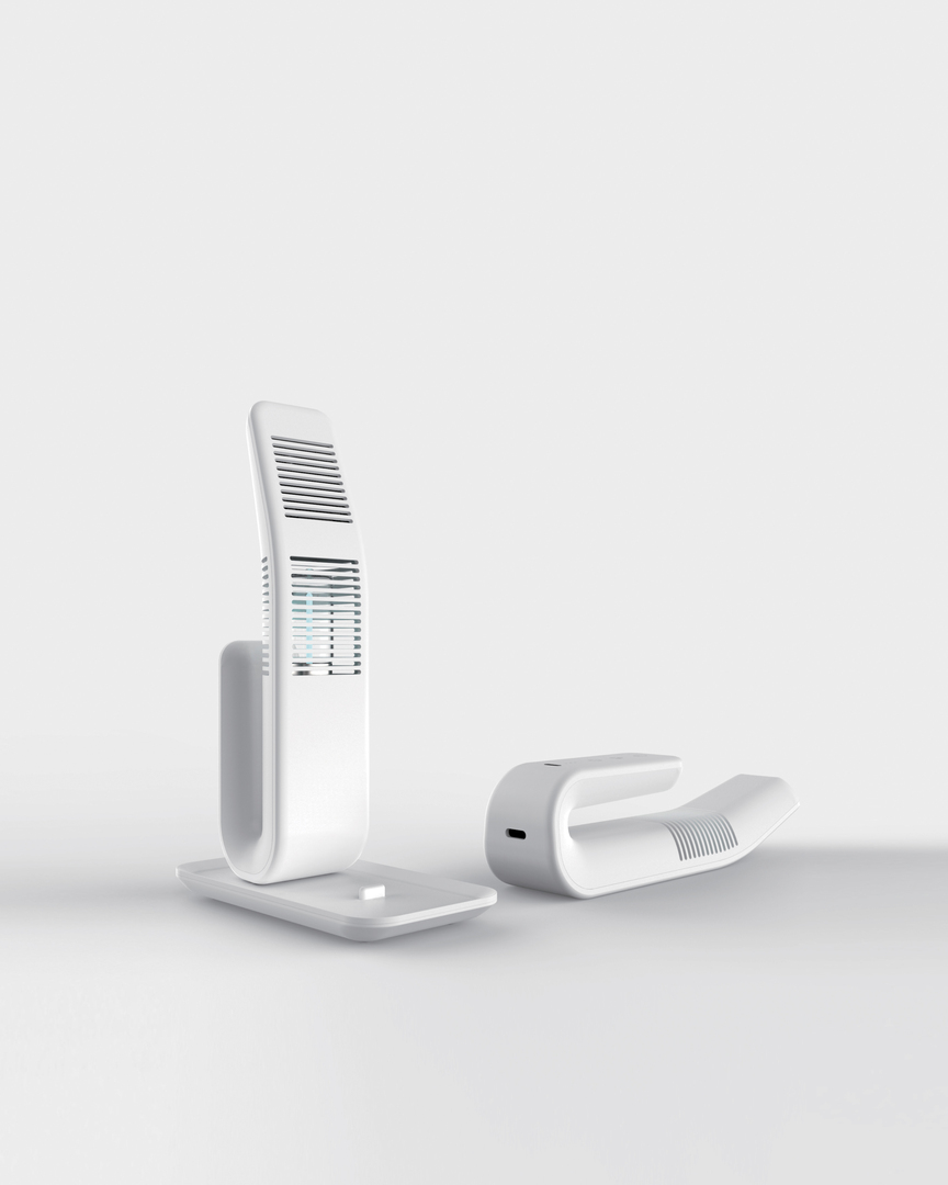 With an O₃ disinfection rate of 99.99%, it effectively maintains the dryness and sanitation of a shoe. This product differs from traditional products in the following ways: It has a rechargeable and wireless function that makes it highly portable; it stays in place by clipping onto the tongue of the shoes without sitting on the footbed thus maximising UV radiation; its passive infrared (PIR) sensor protects from exposure to UV and O₃; last but not least, it has a simple and beautiful industrial design.