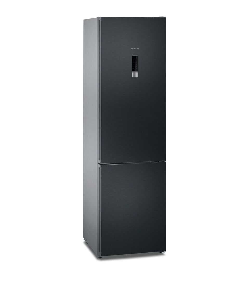 The fridge-freezer combination of the Black Inox Series of energy efficiency class A+++ displays a clear, handle-free front design. The horizontally brushed surface and the warm colouration of the material assure homeliness. The flexible interior fittings with glare-free LED lighting convince with their well-conceived functionality. With the touch display integrated in the front, all functions are at an ergonomic height and are energy-efficiently operable from the outside.
