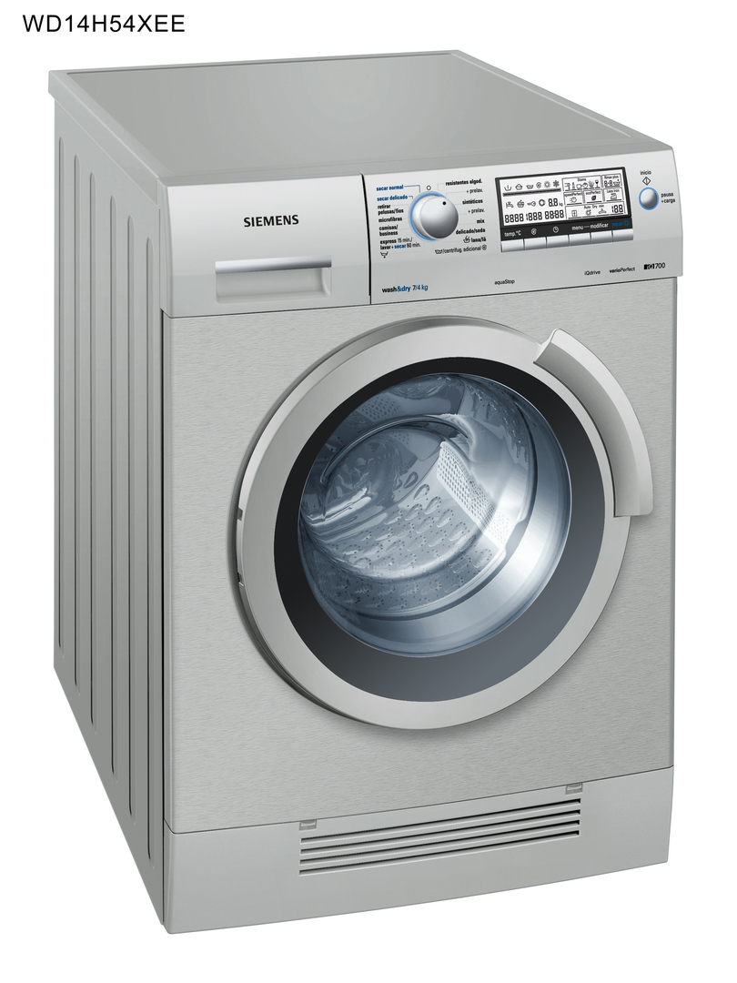 The general appearance of this washer dryer is characterised by a clearly organised interface and a self-explanatory design. The control elements feature a matte surface and harmonise with the silver-coloured front of the appliance. A household load of up to 4 kg can be both washed and dried. It is operated via a central programme selector and a generous display.