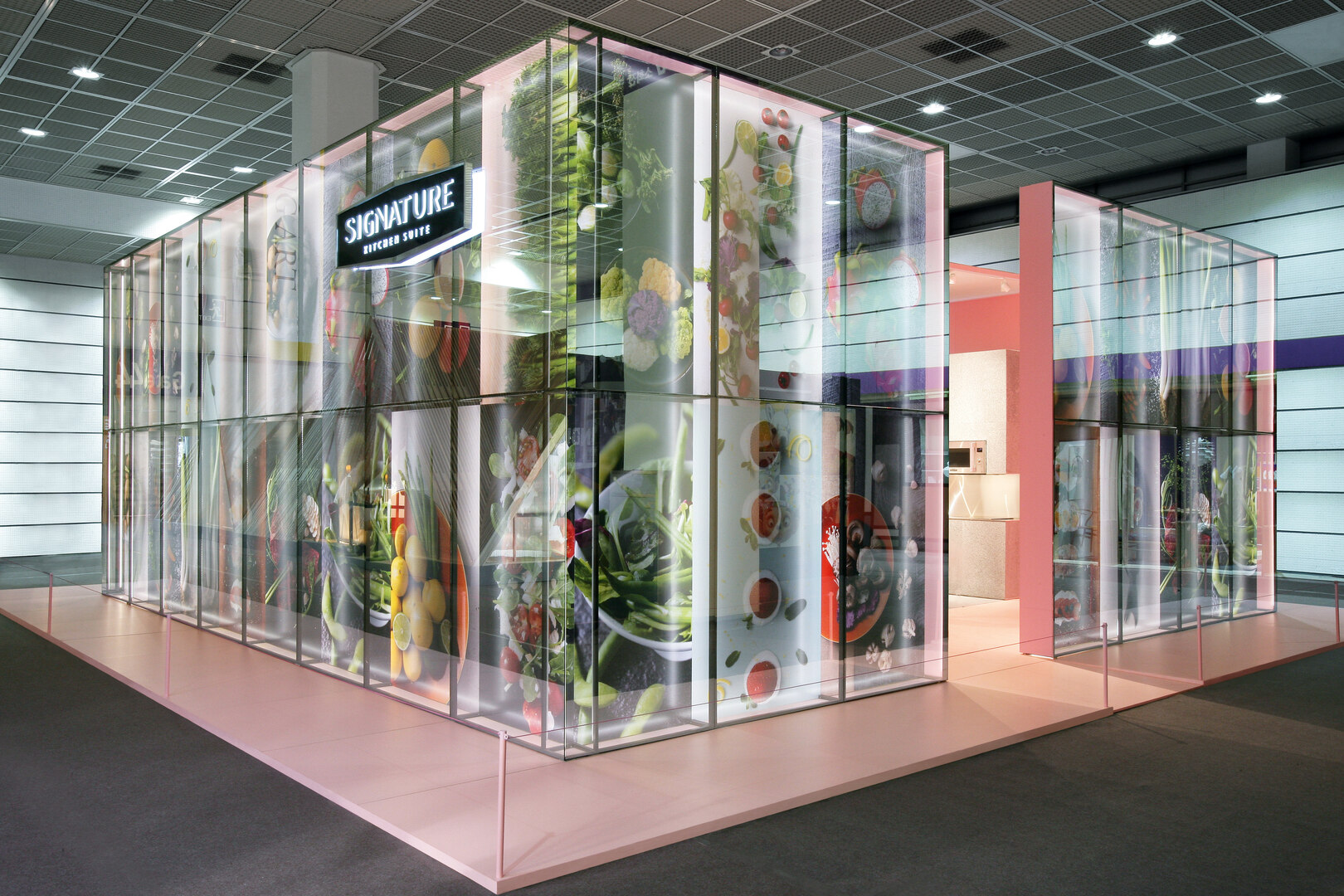 A one-way mirrored facade capturing images of fresh ingredients inside the mirrors characterised this fair stand for a kitchen appliance line. The sleek, clearly defined outward appearance created a connection to the modern design of the kitchen elements. Within the booth, visitors found themselves in a shielded room in which the exhibit and a promotional film were shown. Pink colouring emphasised by subtle illumination complemented the otherwise markedly minimalist architecture and added a soft, seductive touch.