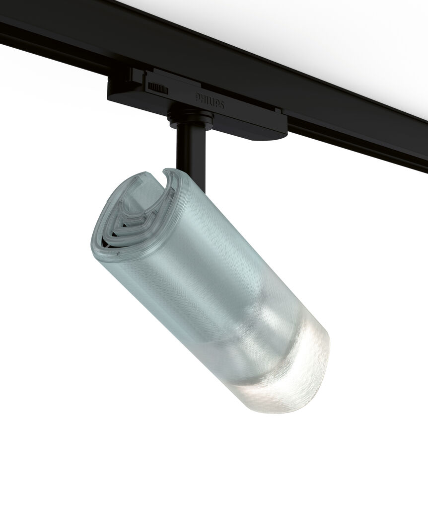 The combination of modular architecture and 3D printing expertise led to the development of the striking Signify MyCreation Smooth spotlight family. The soft square profile with a contrasting inner surface captures the beauty of light and marries recognition value with versatility. A wide range of available materials, textures and colours allows for customised configuration. The use of recycled materials and local on-demand production minimises the environmental footprint. The selection of replacement parts ensures an extended lifespan.