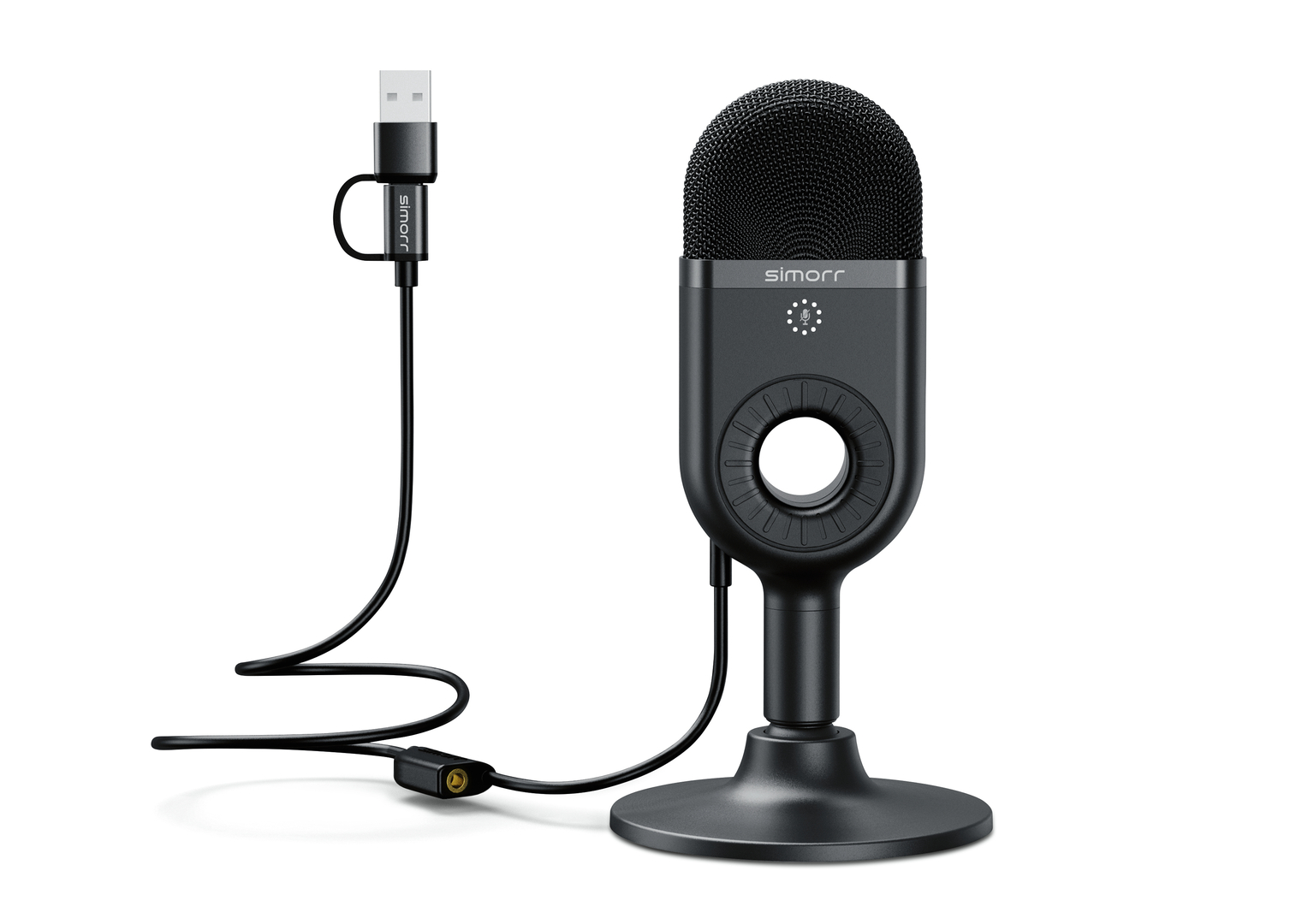 The simorr Wave U1 USB condenser microphone provides convincing transmissions with crisp highs and deep lows thanks to a built-in shock mount, eliminating the need for an external one. The microphone is equipped with a 3.5 mm headphone jack, which allows users to listen to recordings in real time and without latency. Stepless gain control and headphone monitoring support facilitate professional work. The robust, durable tilt mount offers flexibility and can be installed on a standard thread.