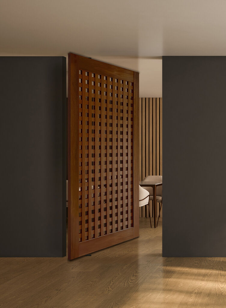 The large Soloist door is designed for wide passageways and can be easily opened thanks to its inward-placed pivot point, resulting in a small radius. The door reaches up to the ceiling and does not require a door frame – it is supported by the upper and lower hinges. If necessary, several doors can thus be lined up to form flexible room dividers. Since no handle is required, the result is a tidy appearance. The design is based on Japanese lattice motifs and creates a calm atmosphere inspired by the Zen style.