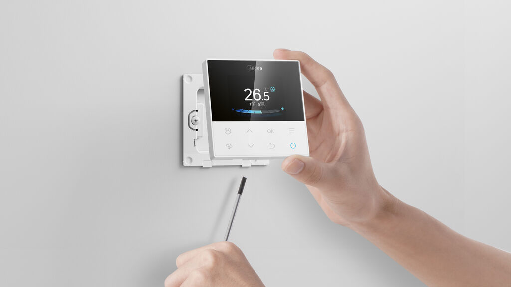 The Space Horizon series includes two thermostats and a remote control. The devices are characterised by the striking contrast between the white casing and black display, which ensures a coherent appearance. While the more compact model is designed for controlling individual systems, the larger version enables the centralised management of several units. The system is complemented by the ergonomic remote control with a clearly organised button layout for location-independent control of central functions.