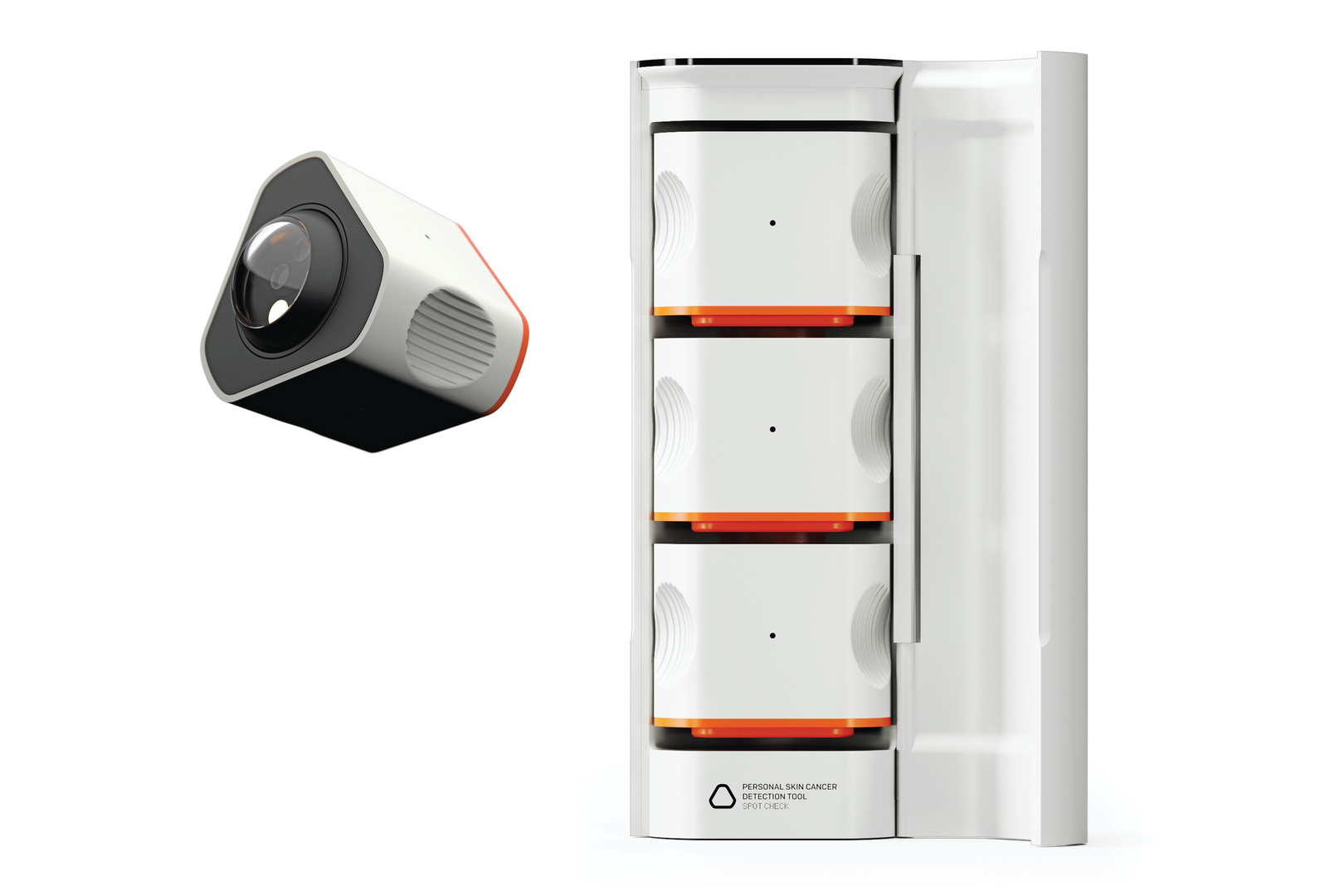 SPOT CHECK combines total body photography and a digital dermatoscope into a single, unified tool that scans the entire body to identify and track suspicious spots, while determining risk with an AI that gets smarter with use. The AI’s job is twofold: [1] compare the images to a library of existing skin cancers to identify suspicious spots; and [2] store and compare new scans against previous data to track changes on the skin. The system starts with full-body scanning, streaming three cameras simultaneously to surveil and track suspicious spots. If the AI detects a suspicious area, it will prompt the user to conduct micro-imaging. Directed by a voice assistant and guided by the remaining modules, the camera precisely targets suspicious areas. A companion app will then refer users if professional diagnosis is required.