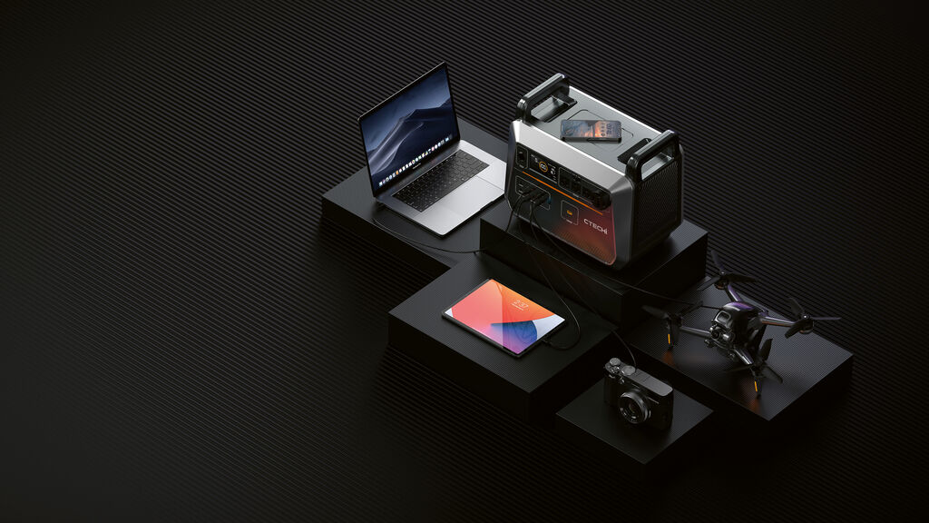 The ST3000 is a portable power station with switchable voltage for versatile applications. Its compact shape with two integrated handles makes it easy to transport and blends into various environments, both functionally and aesthetically. An ergonomic LCD display integrated into the handle shows real-time data on power consumption and output power. The ST3000 can be fully charged from the mains in around two hours and can also be charged from solar power. A 2,000-watt inverter ensures broad device compatibility.