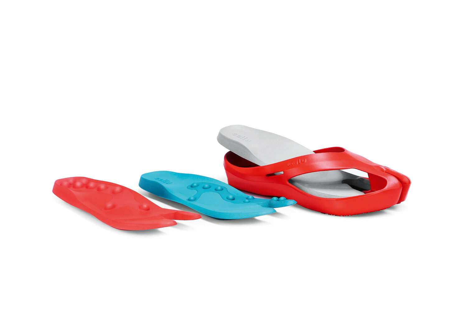 This massage sandal has three interchangeable insoles and the big toe is separated to give better support when standing and prevent the hallux valgus syndrome; an ergonomic everyday vari-ant provides fast drying and ventilation; a second sole with acupuncture points promotes stress reduction and reduces pain; the third model contains special points for prevention, reduction and recovery from plantar fasciitis. The innovative Ccilucell material of the shoe is particularly light and has antimicrobial properties.
