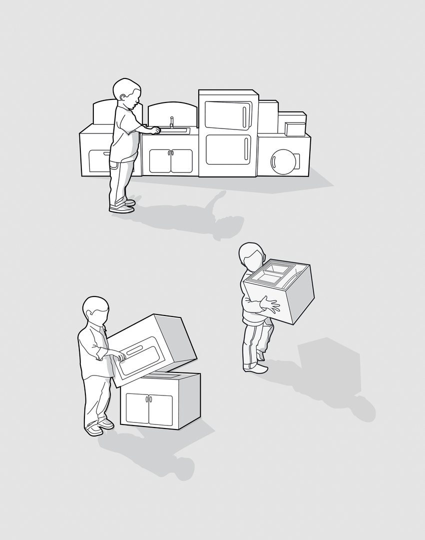 STORAGE KITCHEN TOY is the perfect solution for the lack of storage space in a home with children. Its primary purpose is a children's kitchen play toy set, but it is also easily stored in a nesting manner not unlike Russian matryoshka dolls. Basic role-playing suites for children usually occupy a lot of space at home. However, this product is designed in a system such that a smaller box or part of the set can be stored within a larger box in succession.