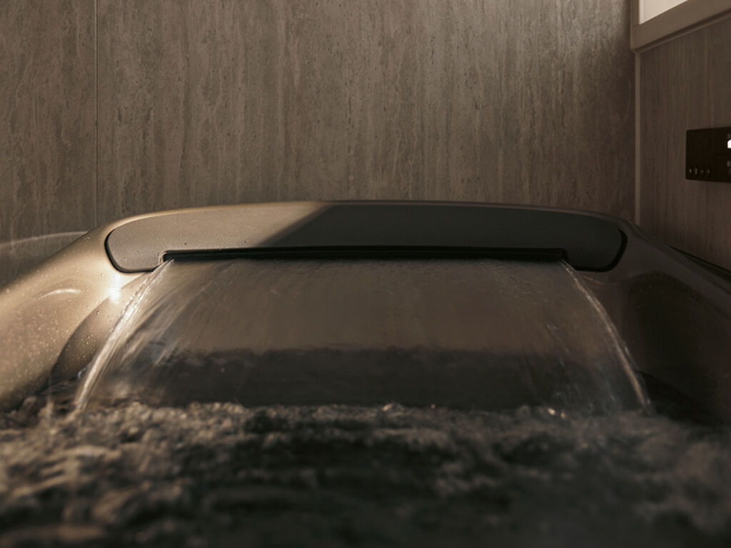 SYNLA offers elegant components that can be individually combined to create harmonious bathroom designs. There is a choice of 33 wall patterns, 12 shelf types, 10 floor colours and six tub colours. The ergonomic bathtub shape and indirect lighting elements with six adjustable modes contribute to relaxation, while quick-drying, non-slip surfaces ensure safety. An automatic cleaning function and the use of electrolysed water make it easy to keep the floor clean.