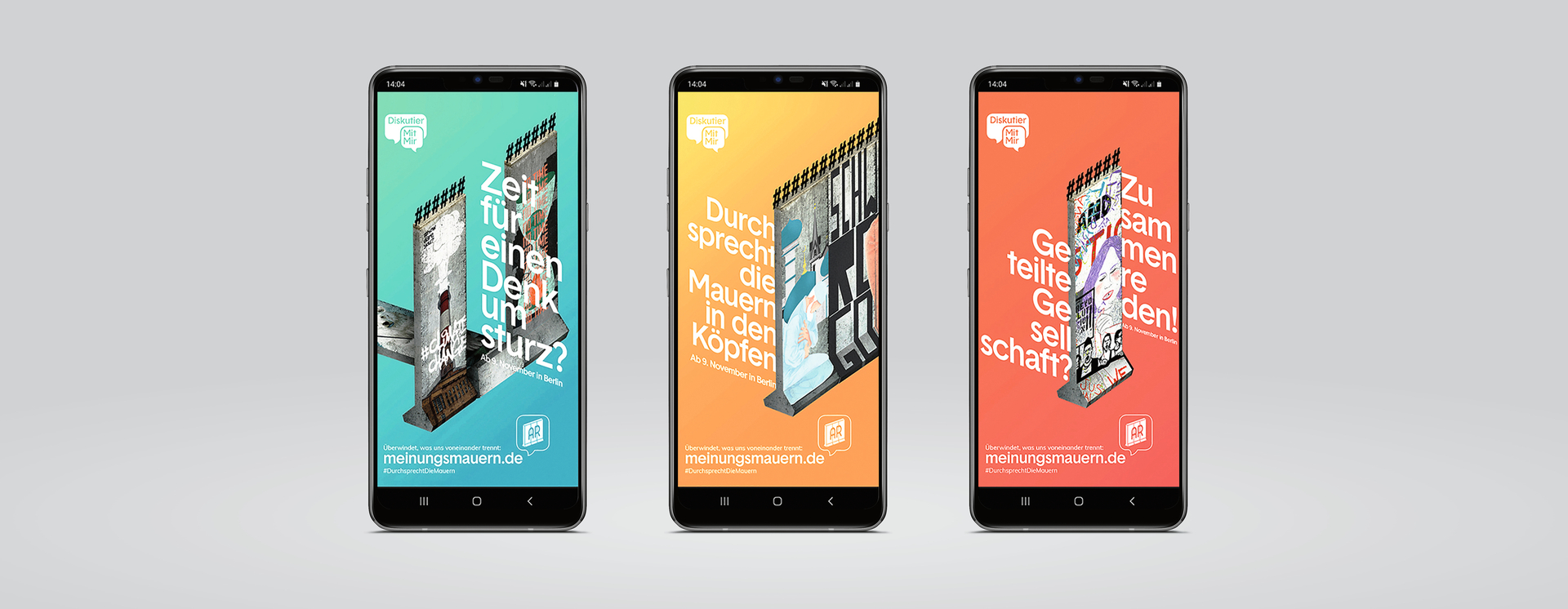“Diskutier Mit Mir” (Discuss with me) is a non-profit chat platform for political dialogue. On the anniversary of the day the Wall came down, this Berlin-based start-up launched this AR experience for browser-based mobile environments as a way to tackle the ongoing polarisation and expression of hate in German society. Controversial comments from the web were transferred onto life-size AR installations of the Wall. The aim was not only to show the enormous opinion blockades on both sides, but also to offer a chance to overturn these invisible walls and bring people with different views and opposing opinions into direct conversation by triggering 1:1 chats.