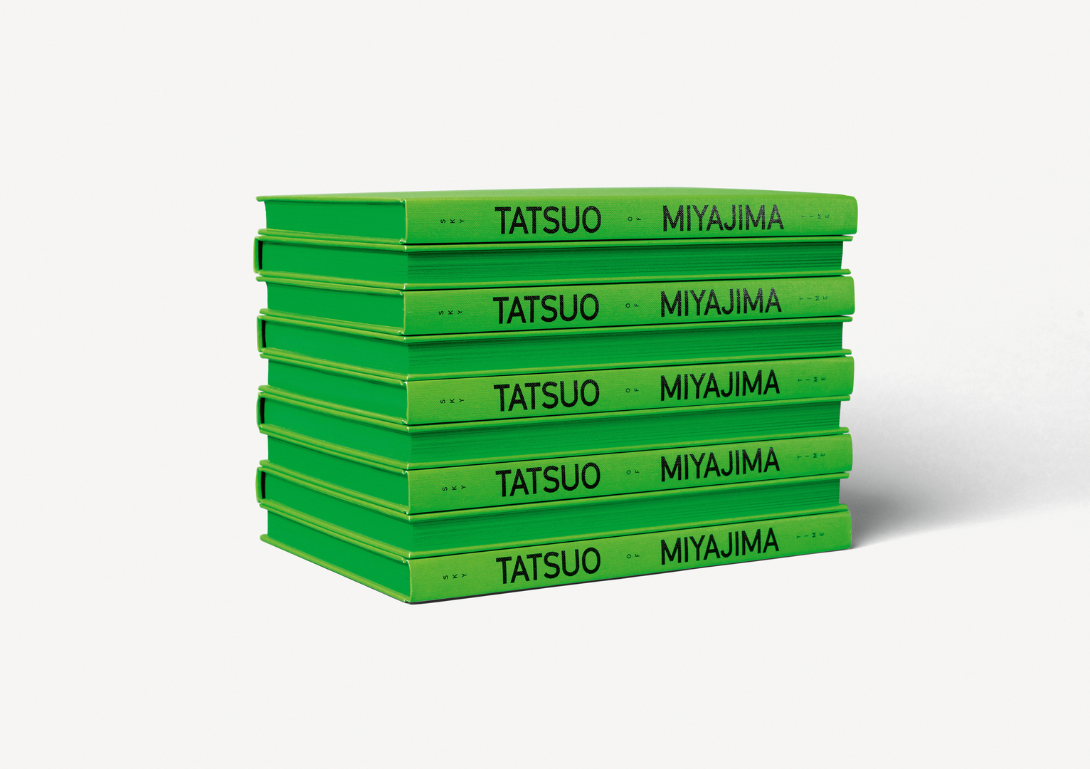 Sky of Time is the title of an exhibition by the famous Japanese artist Tatsuo Miyajima. It consists of a number of LED devices, twinkling in a dark room like stars to reflect concepts such as infinity and eternity. The choice of the neon green colour was inspired by the northern lights the artist witnessed on his visit to Rovaniemi. The same green was chosen as the main colour of the accompanying publication, which uses letters in a mechanical typeface to create a link to Miyajima’s LED numbers. Images of the exhibition are printed with special colour profiles that allow the use of an additional spot colour – the characteristic neon green.