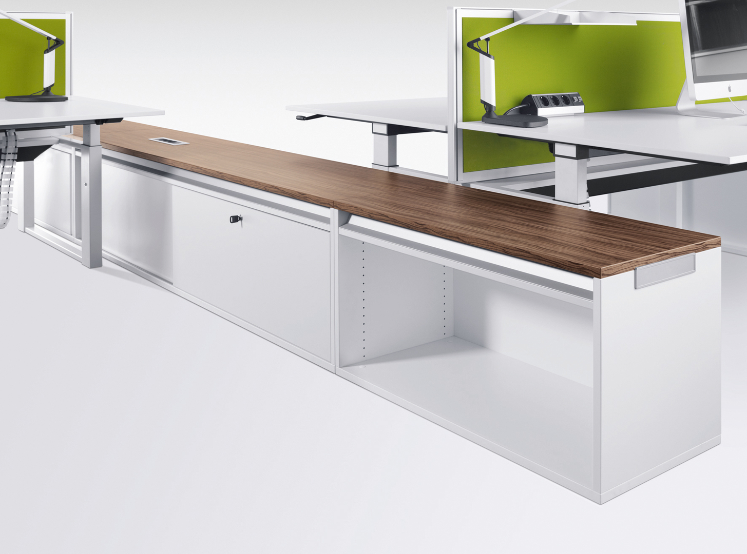 “temptation storage” is a cabinet furniture system to complement office workstations. It is suitable for the configuration and partitioning of offices, and can be used as a linking or room-structuring element. Power and network cables can be fed into the integrated electrical connection level and connected to further workstations or individual devices. In addition, seat and backrest cushions allow spontaneous meetings.