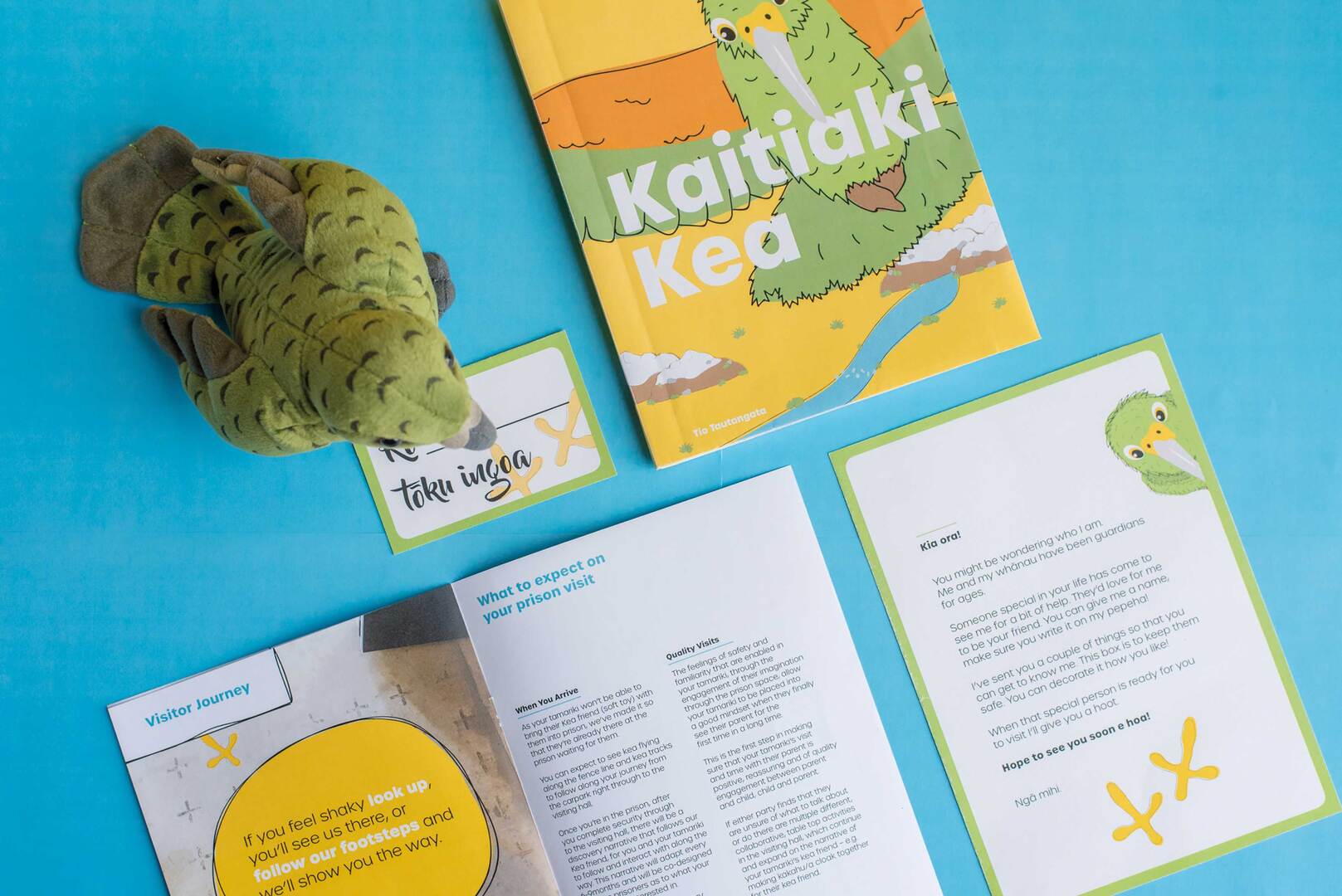 The Kea Project presents its interventions in three phases. The first toolkit is introduced in the child’s home environment after a parent has been arrested. This initial pack offers a base layer of support for our invisible child, reassuring them and acknowledging the emotions they are feeling. A second toolkit provided after a secured prison visit aims to change the invisible child’s perception of prisons: from a cold and scary environment to one that resonates with seeing their parent again. Graphics of Kaitiaki Kea and a familiar narrative leads the child through. The third phase focuses on spatial changes in prison environments, physically giving visibility and a welcoming feeling to the child. The Kea Project seeks to rehumanise New Zealand’s justice system by providing invisible children with a sense dignity and trust.