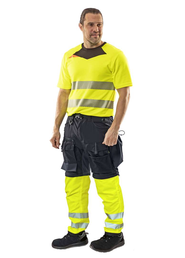 Converting into three functional garments, the zip off legs of this work trouser can be reversed, to transform the trouser into a class one high-visibility trouser for increased visibility. The zip off legs can also be completely removed to convert the trouser into shorts for hot stress conditions.