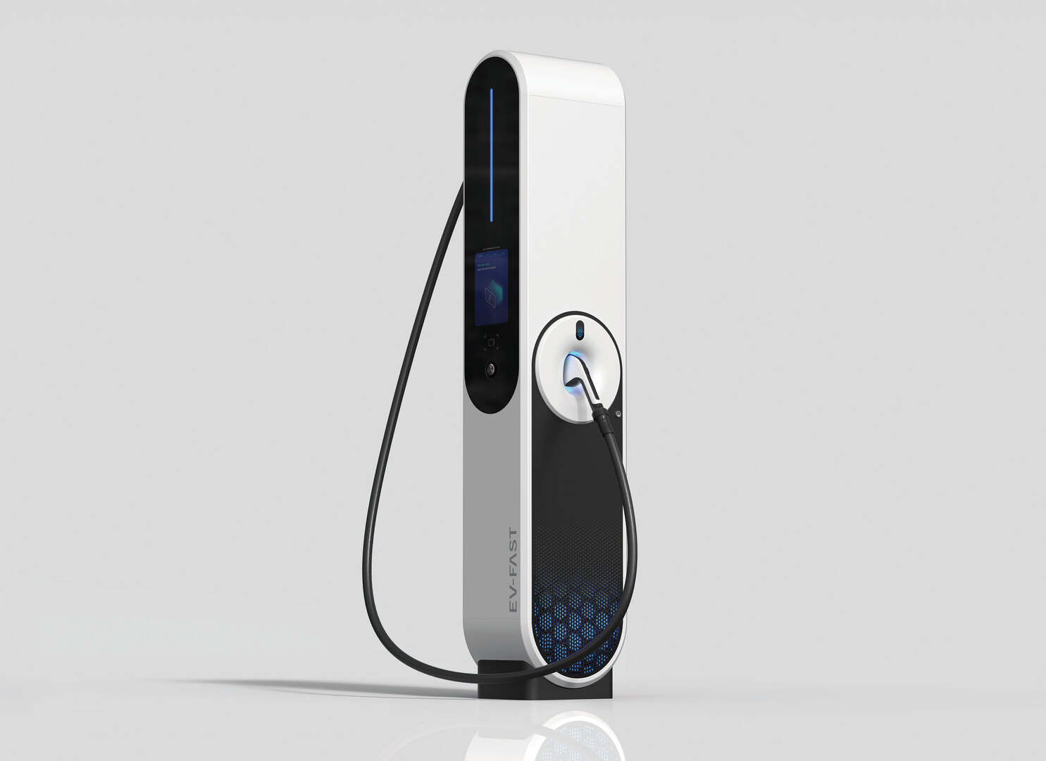 The Ultra-Fast EV Charger 400kW increases the utility and charging efficiency of the charger with CCS (Combined Charging System). It is provided in a range of power options from 100kW to 400kW and power is distributed among the chargers automatically to optimise the efficiency of the charger, thus reducing charge time. Various UX ideas, based on in-depth analysis of user habits and processes, have also been applied to enhance usability and user experience. Overall, its curved formative language, white exterior and bright blue lighting gives the charger a friendly and clean image.