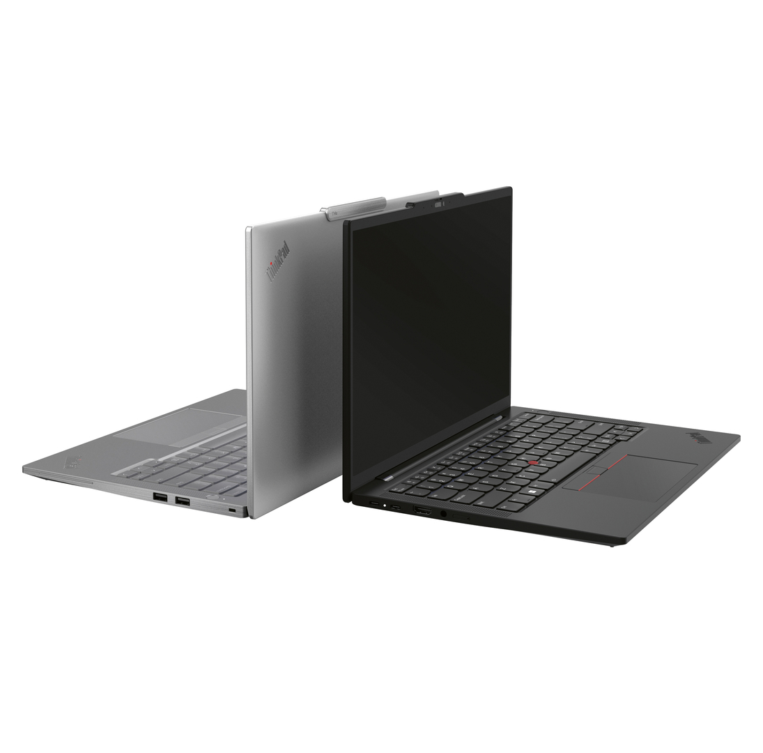 The compact ThinkPad T14s Gen 5 laptop has a slim profile thanks to the optimal fan placement at the rear. The display bezel is also reduced so that the screen takes up 90 per cent of the surface area. The housing of the grey device variant is made of sandblasted aluminium and has brushed side panels. A black model made of a carbon fibre-magnesium alloy with an anti-fingerprint coating is also available.