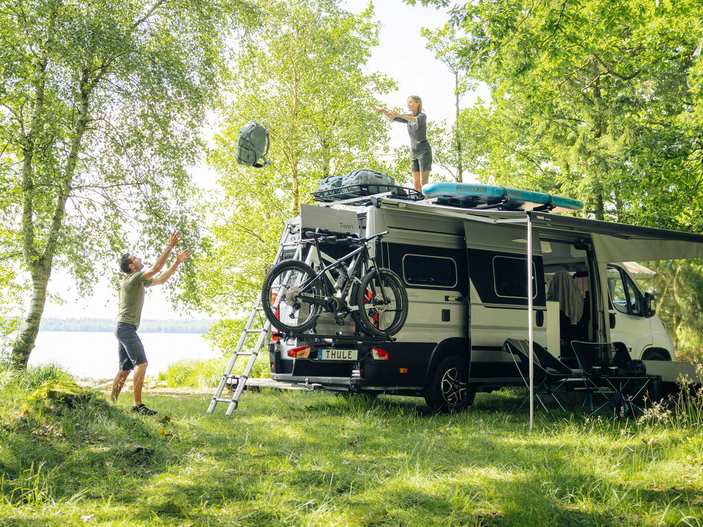 The Thule VeloTrack is a bike rack for vans. With a load capacity of up to 60 kg, it is also suitable for heavy bicycles such as e-bikes or mountain bikes. Installation is carried out without tools via a clamp on the rear door, so that the tailgate can be opened even when loaded. A height-adjustable carrier frame makes loading and unloading easy. The modular design allows for future upgrades, such as a fat bike adapter or lighting system. Detachable bicycle arms with Thule AcuTight torque limiters reliably secure the load.