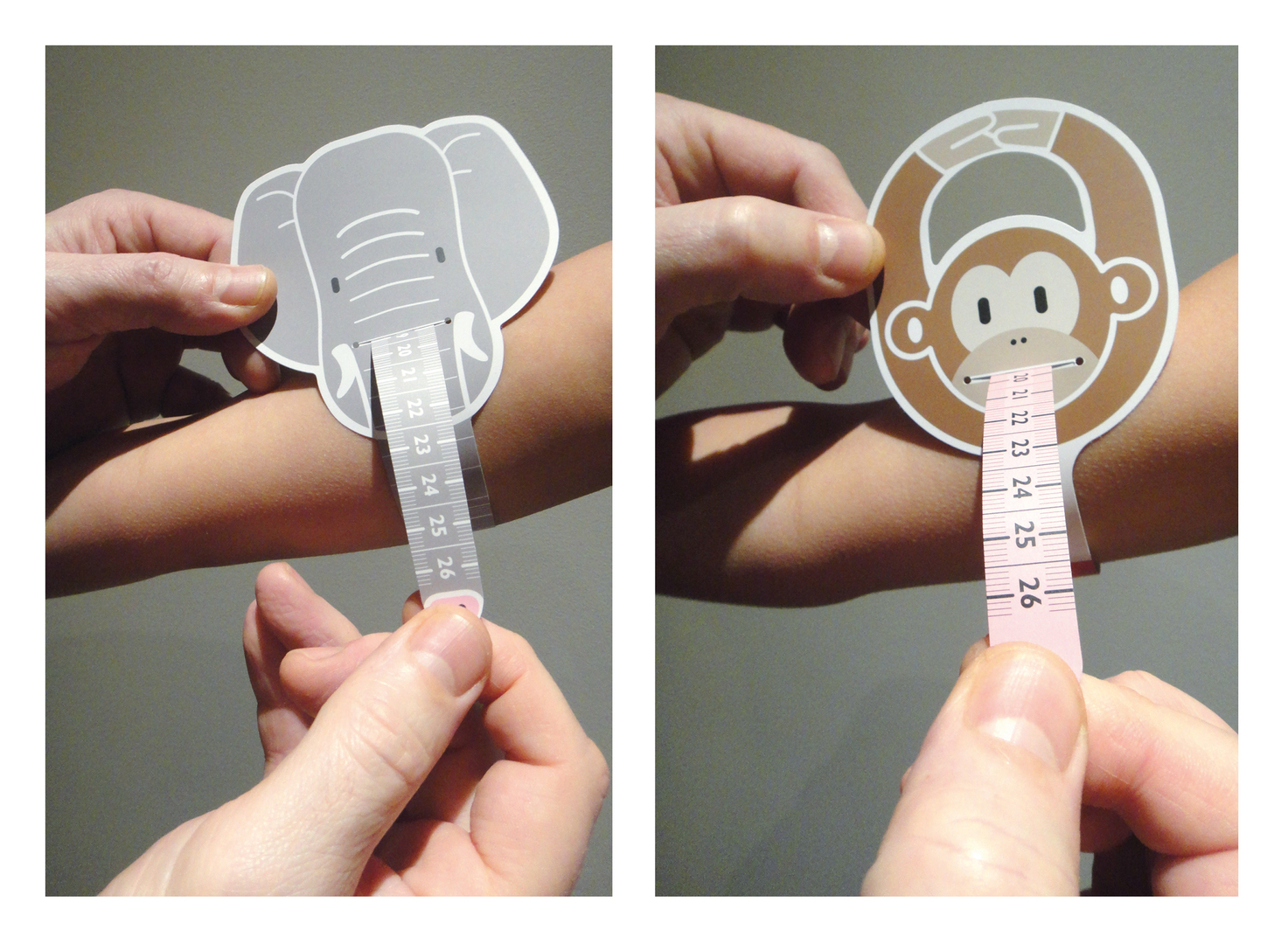 The Trunky & Monkey upper-arm measuring strips help detect malnutrition in young children in underserved areas. The circumference is measured by placing either the elephant’s trunk or the monkey’s tongue around the upper arm and then joining it to the animal’s head. Since the measuring tapes are very inexpensive to produce, they can be given to the children to play with after the examination.
