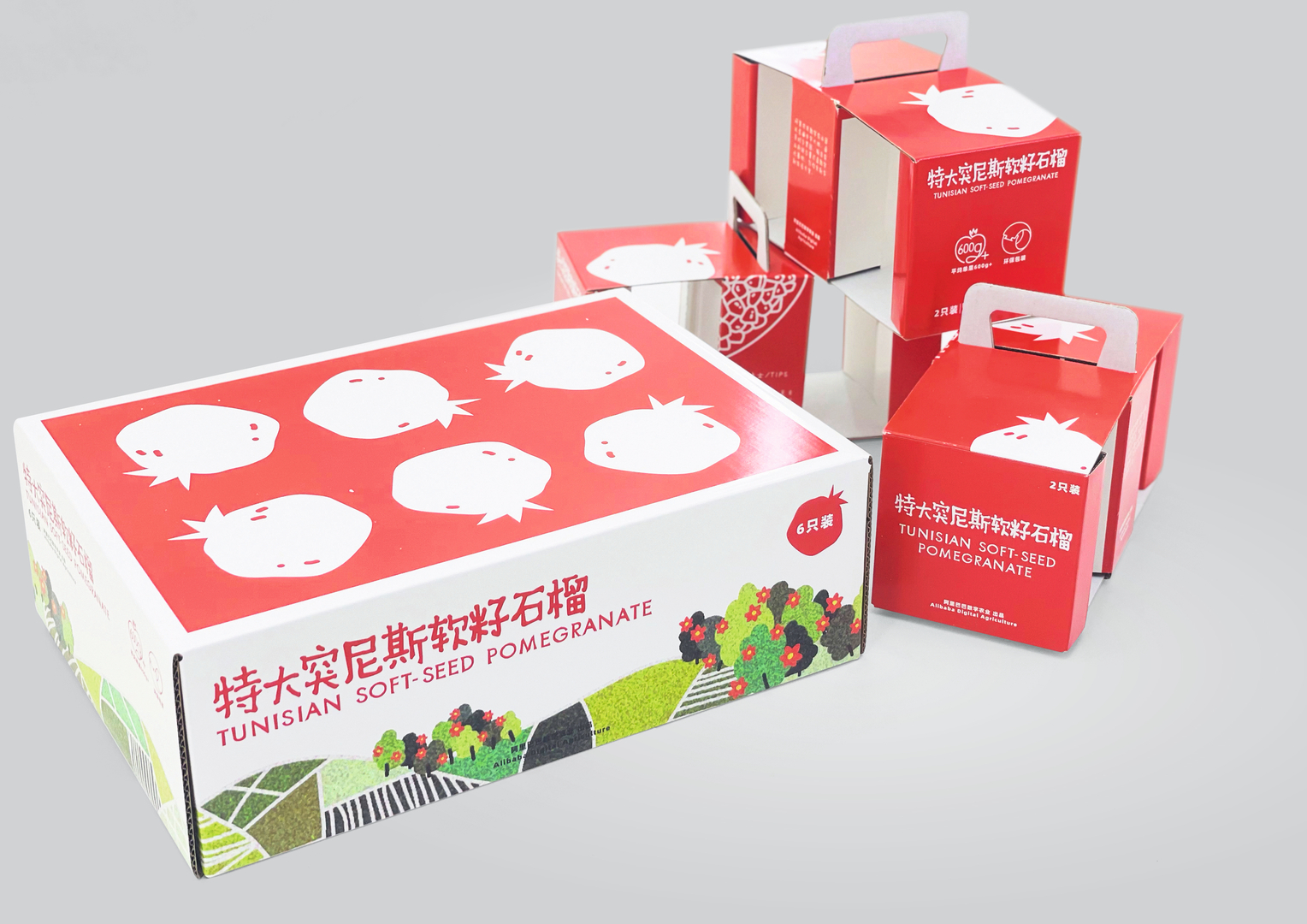 This eco-friendly two-part packaging for pomegranates does not require the foam which is usually used. By cutting and folding the cardboard, a box was created which is solid and can also withstand a lot of pressure to protect the fruit. In order to keep costs low, it is printed in one colour. The upper part is designed in such a way that it intuitively points to the content and its special taste. An additional tray contains three of these boxes. It is printed all around with coloured illustrations of the region where pomegranates come from.