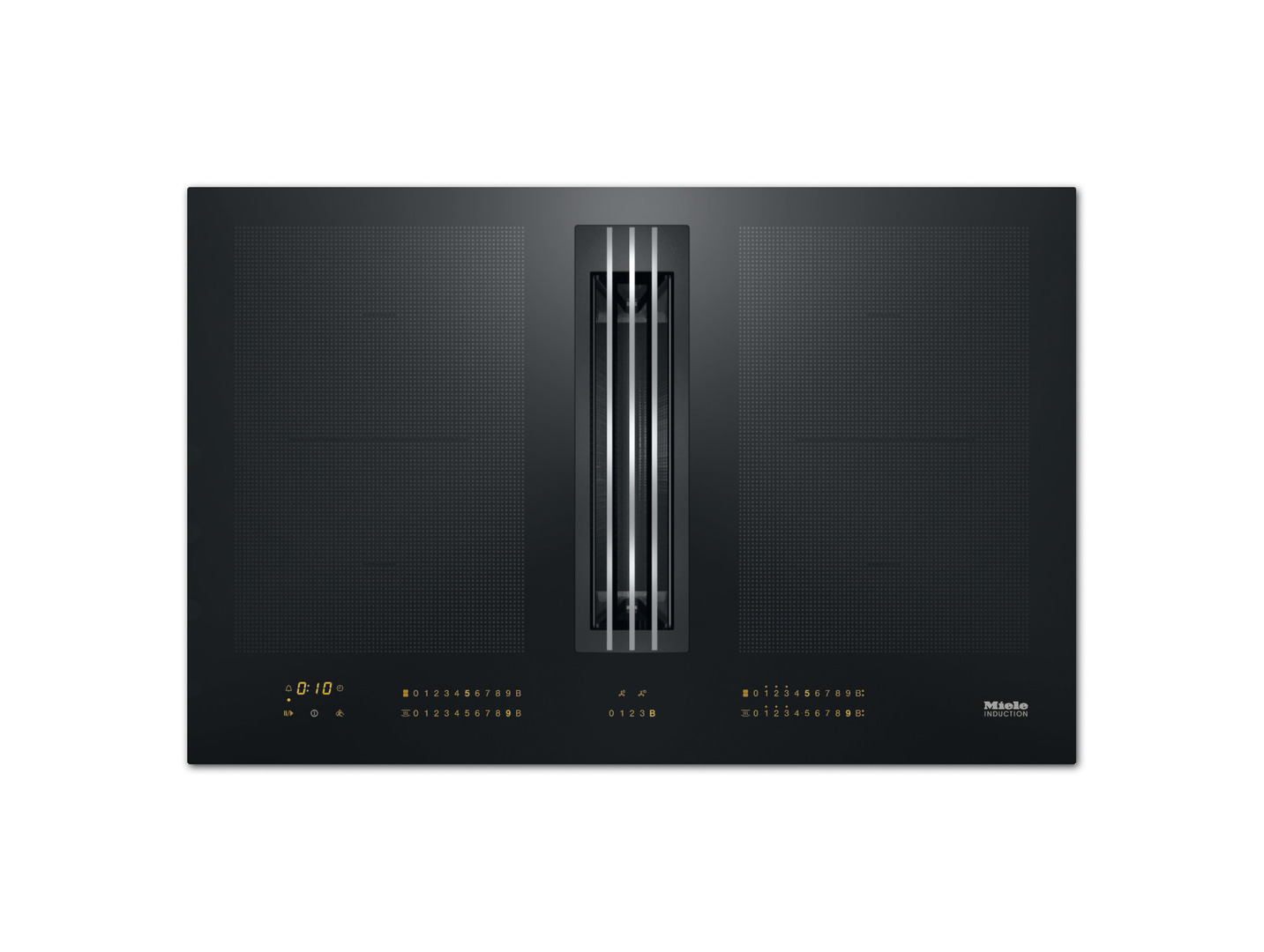 TwoInOne combines induction technology with flexible cooking zones and effective vapour extraction in one device. The central extractor is surrounded by two variable PowerFlex cooking zones. Outwardly, the extractor, which adjusts its power automatically to the cooking process, is only recognisable by the ventilation grid; the ventilation technology itself is located in the lower cabinet. The touch operation of the cooking zones and the vapour extraction is made via number range controls with yellow display elements.