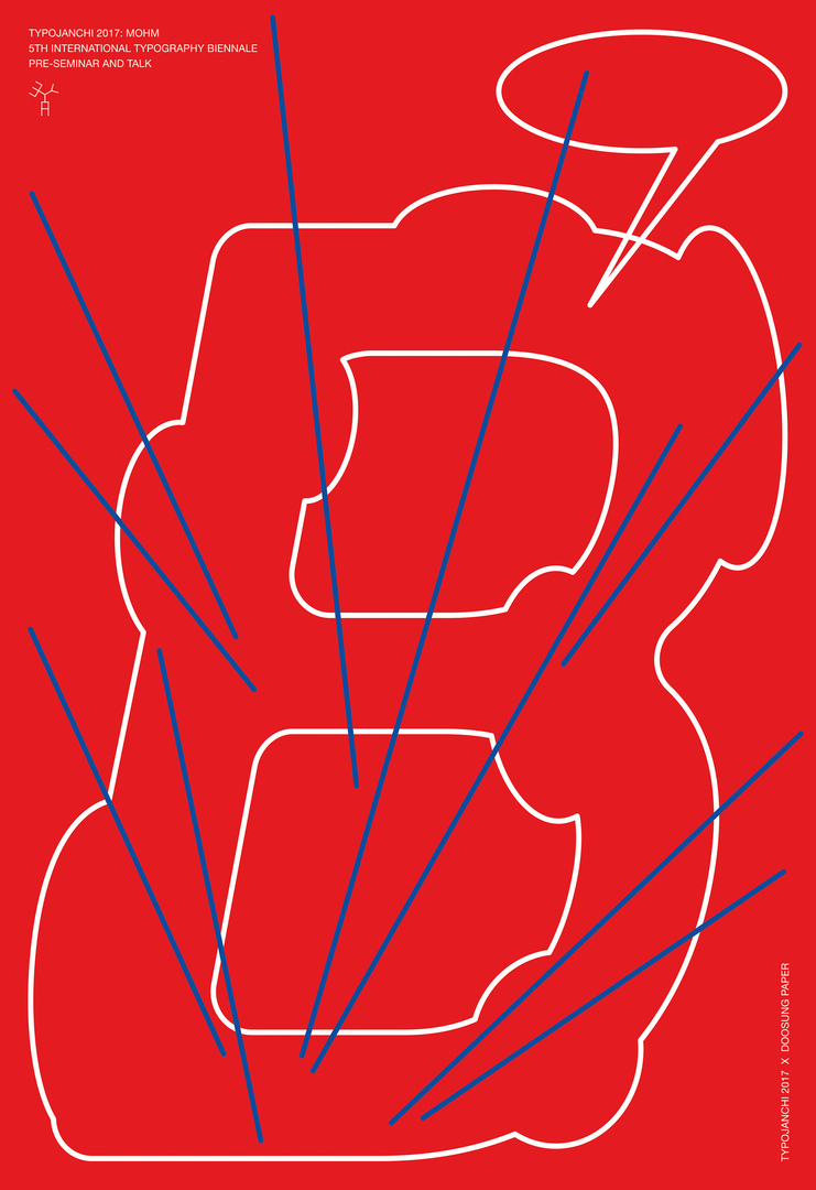 Mohm is the Korean word for body and the motto of the 5th International Typography Biennale in 2017. The poster series announces the preliminary talk and seminar of the event. In this context, the letters B and T, which are the key elements of the design, stand for body and talk. The font called Wiggle and the fine white lines make the contours appear to be flexible and in motion. In contrast to that, even with respect to colour, stand the straight blue lines, which intersect the letters and visualise communication strands. The speech bubbles are a visual reference to the lectures held as part of the seminar.