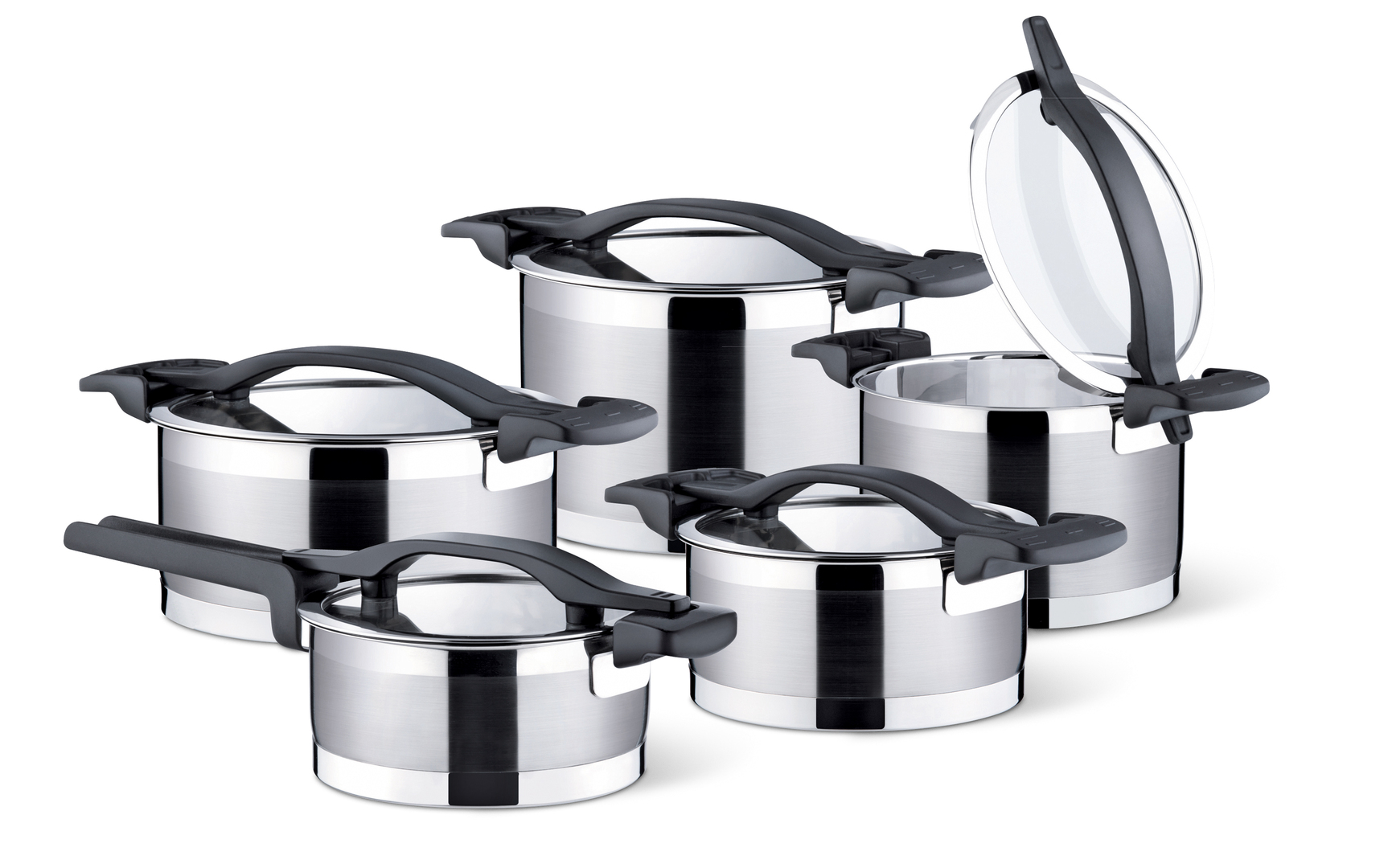 A functionally well thought-through design concept characterises this cookware series. The flexible handling of the lid enhances usability considerably.