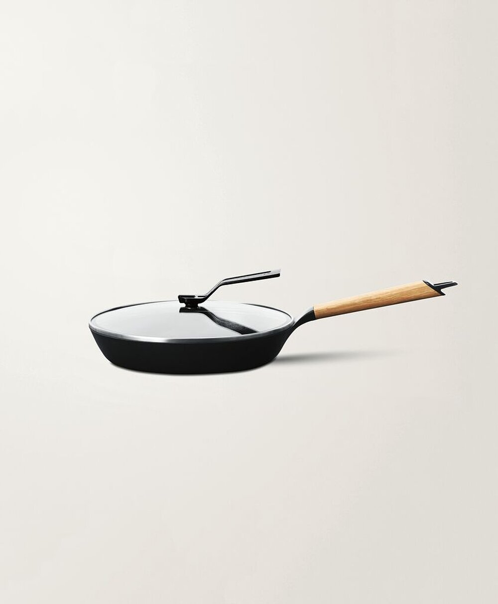 This pan is the expression of a design that follows the maxims of durability and functionality to further advance this traditional kitchen tool in a remarkable manner. With its elegant wooden handle, which does not heat up during frying, it is very easy to hold and handle. The convenient-to-place lid also makes the pan take centre stage in the kitchen, while the innovative hydrophilic properties of the enamel coating ensure perfect frying results.