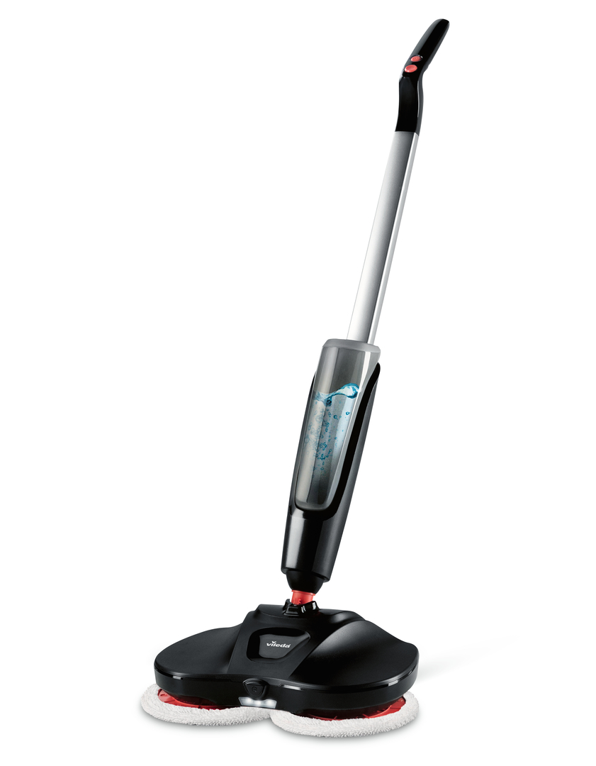 This cordless electrical spray mop works with counter-rotating microfibre pads suitable for different types of flooring. The refillable water tank facilitates speedy cleaning without the need for an additional bucket. The high performance of the appliance means it can be used efficiently without applying much pressure. A smart spray button allows the user to regulate the amount of water required. Its low weight and flexible swivel joint make the Vileda Looper highly manoeuvrable.