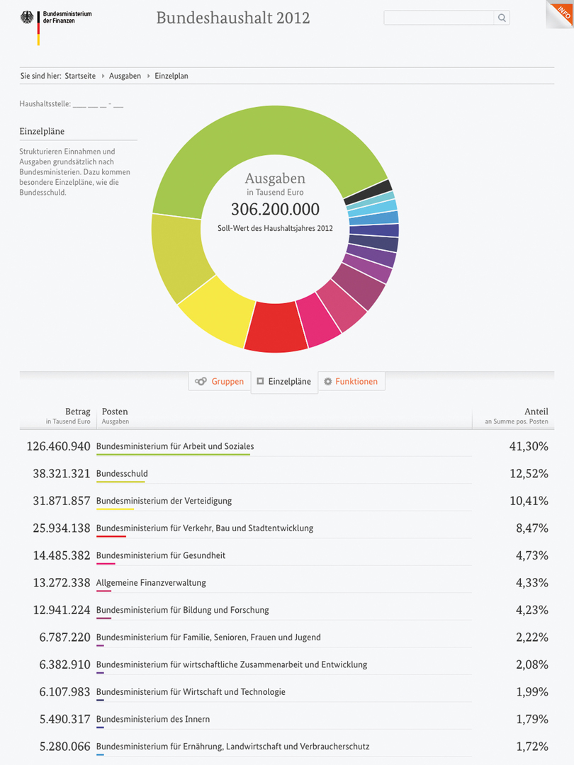 The German federal budget involves an enormous amount of money – over 300 billion euros. The budget plan covers more than 2,700 pages. In collaboration with the Bundesministerium der Finanzen (German Federal Ministry of Finance), Pixelpark has succeeded in making this data volume accessible to everyone. All revenue and expenditure can now be found in an easily accessible data visualisation that can also be viewed on smartphones and tablets. This makes the budget understandable – even for non-specialists.