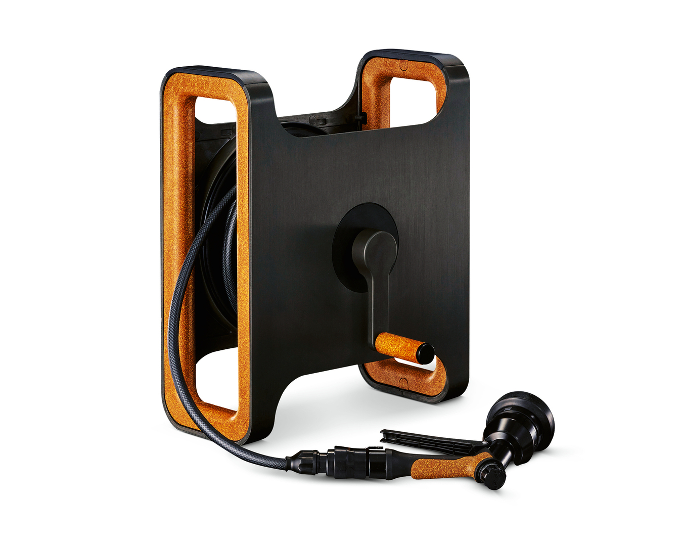 To achieve long-lasting stability, this hose reel is made of recyclable aluminium. Only the external surface of the aluminium frame is coated with synthetic resin to protect the hose against heat from sunlight. The recessed grips are lined with cork for a natural, pleasant feel. The precise reel system prevents the hose from deforming when being rolled up, which reduces the winding weight and friction noise.