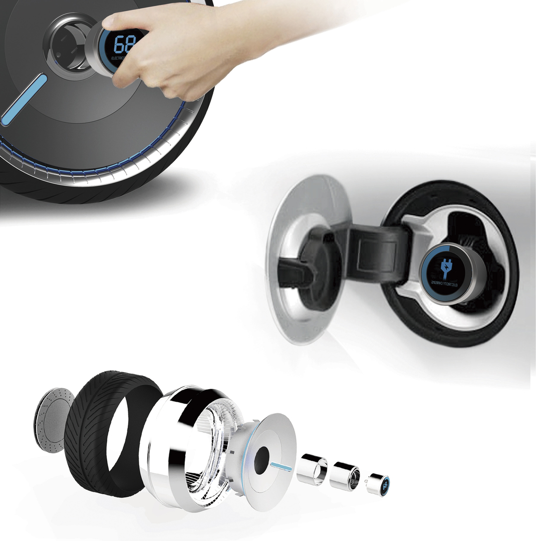 The demand for electric cars has been quickly increasing in recent times but due to present infrastructural insufficiencies, electric car users face difficulties finding charging points to recharge their car batteries. This creates a certain amount of reluctance in people to switch over to electric cars. On average, an hour’s charge on 220V allows an electric car to drive over 10 kilometres. To recharge a car completely, an electric car user would need at least 10 hours of charging time. As an alternative solution, Wheel Battery proposes an auxiliary battery that can be installed in the wheels. This auxiliary battery gets rapidly charged by the electricity generated by the car’s running wheels. It functions as an alternative to the car battery in the emergency event that no charging points are available. Wheel Battery has been designed so that the user can easily plug in and unplug. For even more convenience, the battery status and charged amount is also indicated on the exterior of the auxiliary battery.