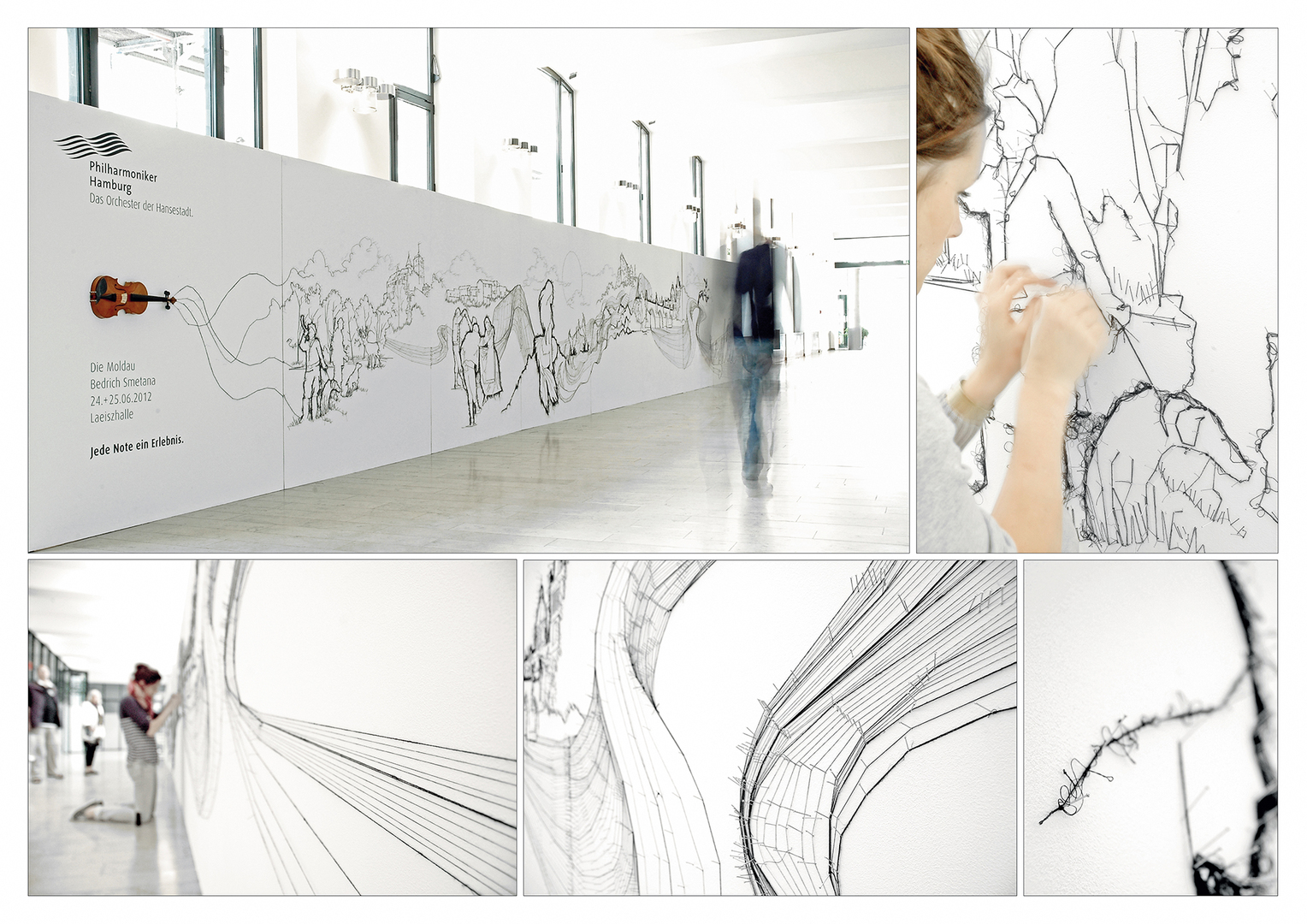 In June 2012, the Philharmoniker Hamburg wanted to attract new visitors to their upcoming concert “The Moldau” (Vltava) by Bedřich Smetana. The solution for the design concept consisted of a 16 by 2 metre billboard, on which artist Debbie Smyth visualised the storyline of this classical piece of music, using 5,900 nails and 1.2 km of string. For five days, she worked live in public in front of passers-by in a shopping arcade in Hamburg. On the billboard, the strings of a real violin flow into all the scenes Smetana was picturing with his music, including a hunting scene, a farmer’s wedding, nymphs in the moonlight, the river growing into rapids and finally reaching the Charles’ Bridge in Prague. The sonic world of this famous piece of music is thus turned into a tangible visual experience that is not only translated into and staged as a highly unusual illustration. In addition, the music also becomes a public event as the task emerges in an original and innovative realisation.