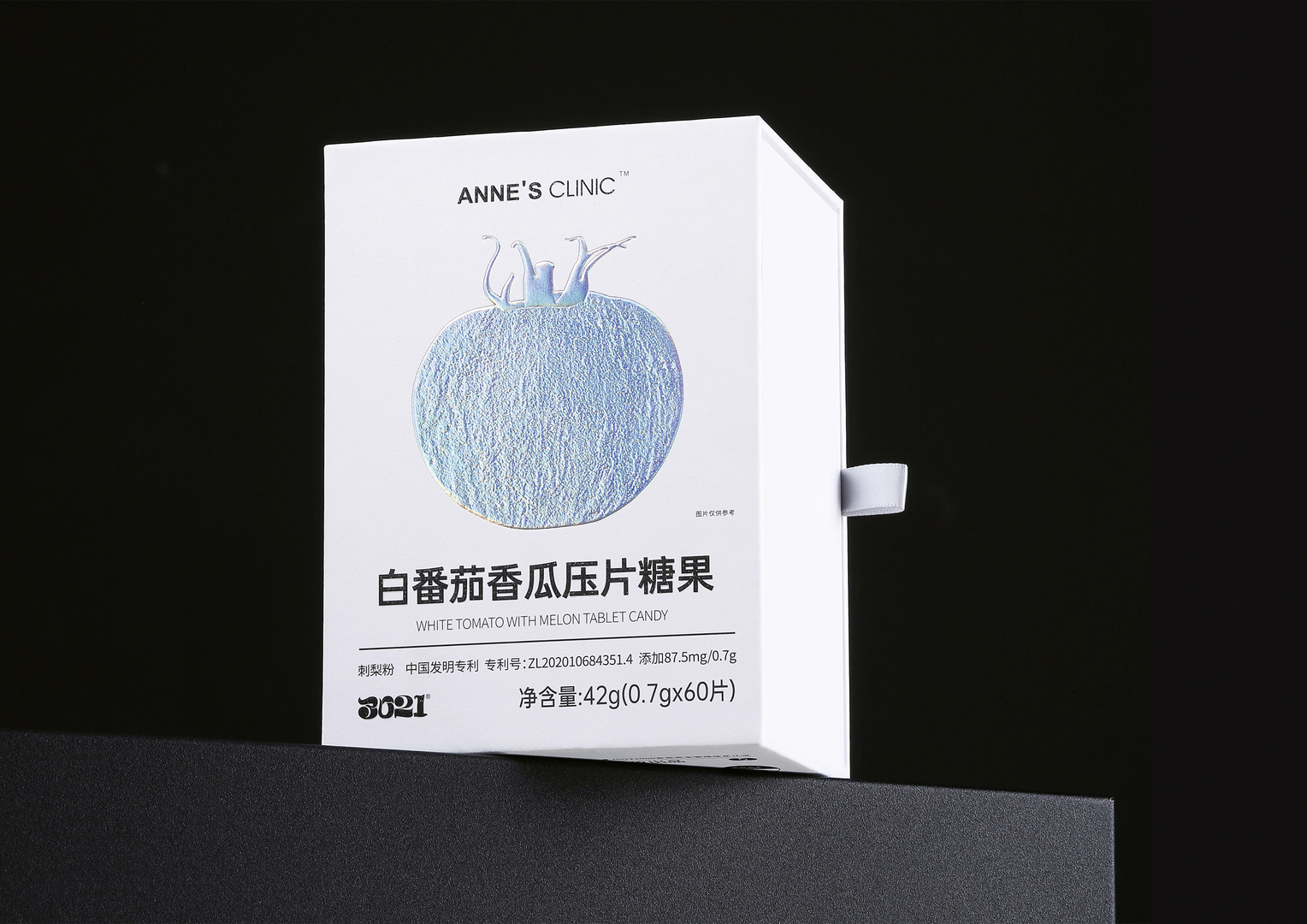 This dietary supplement mainly contains ingredients from white tomatoes, whose carotenoids are intended to act as oral sun protection. With a relief embossing and silver-coloured laser printing, the illustrated fruit is elegantly showcased both on the gift packaging and on the label of the glass flacon inside. A well-padded inlay protects the product from shocks and holds information cards in a recess. The graphic design frames the key visual on the outer packaging in a restrained manner, thereby contributing to a stylish presentation.