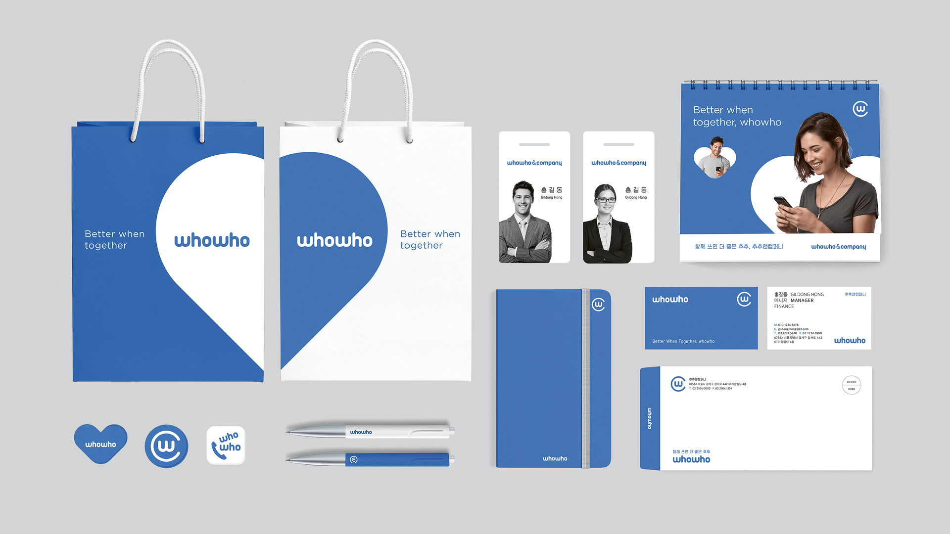 whowho is a Korean mobile service brand that offers convenient products and services. The development of the visual brand identity was inspired by the slogan “Better when together, whowho”, which aims to reflect the brand value. The word mark and graphic element in the form of a blue heart are emphasised by the monochrome colour palette, while the rich, vibrant blue embodies the brand’s technological nature. The word mark and graphic element are also consistently implemented throughout the various online and offline channels, including merchandise und stationery, to enhance the brand experience.