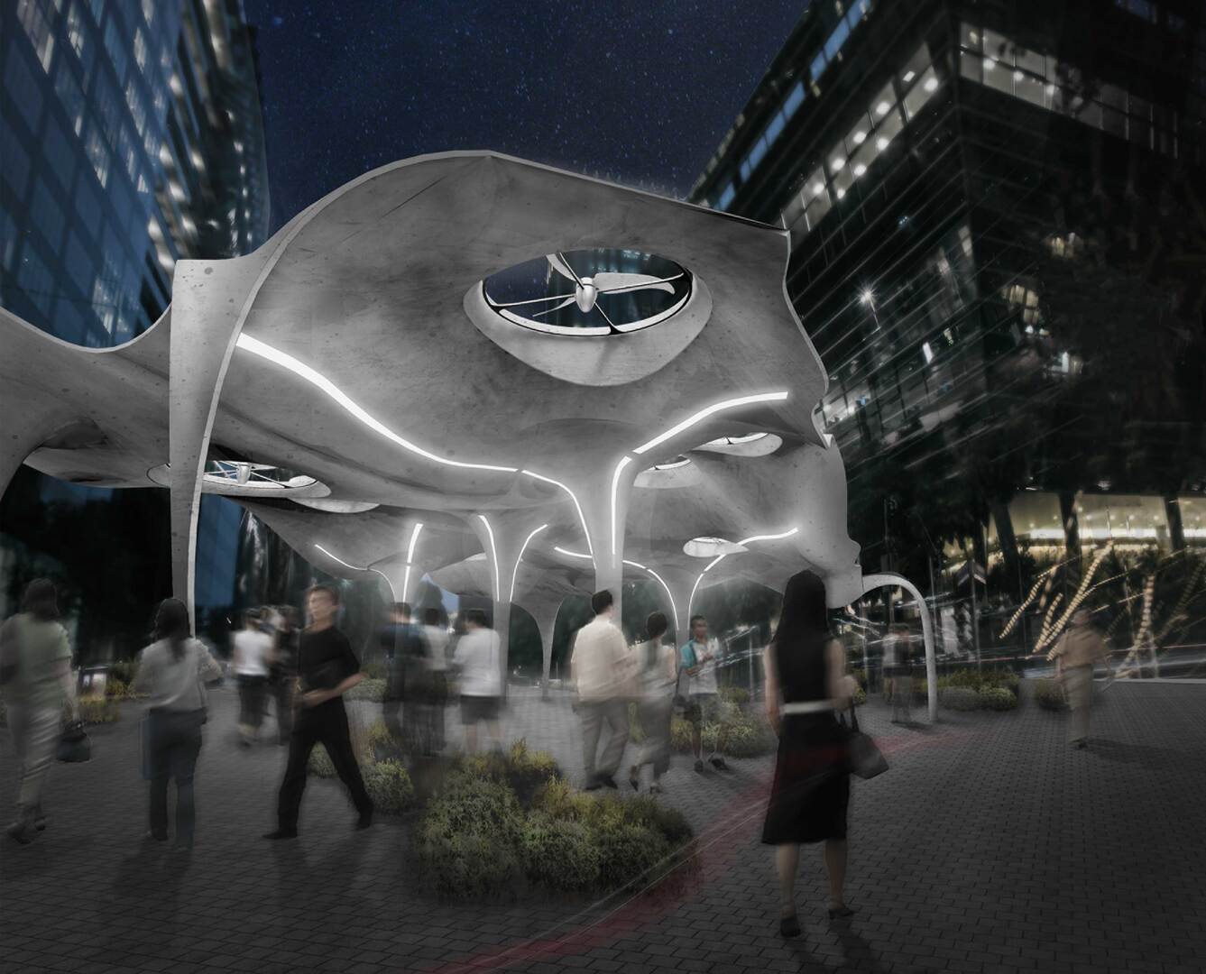 Wind Pavilion incorporates an intelligent ‘natural resources recycling system’ to create a more comfortable public space. There are two main building wind types – corner wind and vortex wind, both of which produces strong and powerful cyclone. By collecting ‘building wind’ and turning it into electricity, the power can be stored within each column and further provide a resource recycling system. By collecting rain through the filtration system, water can be filtered and stored underground for watering plants.