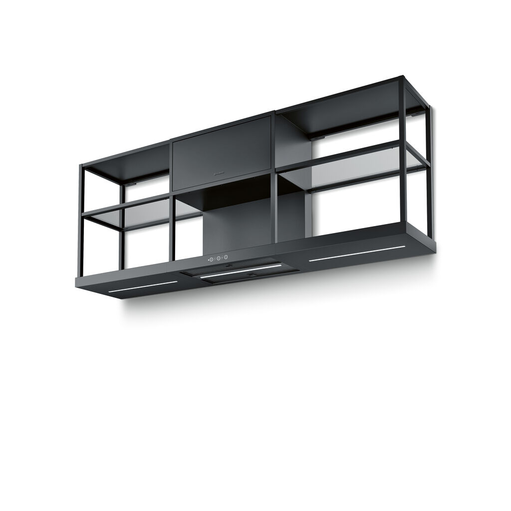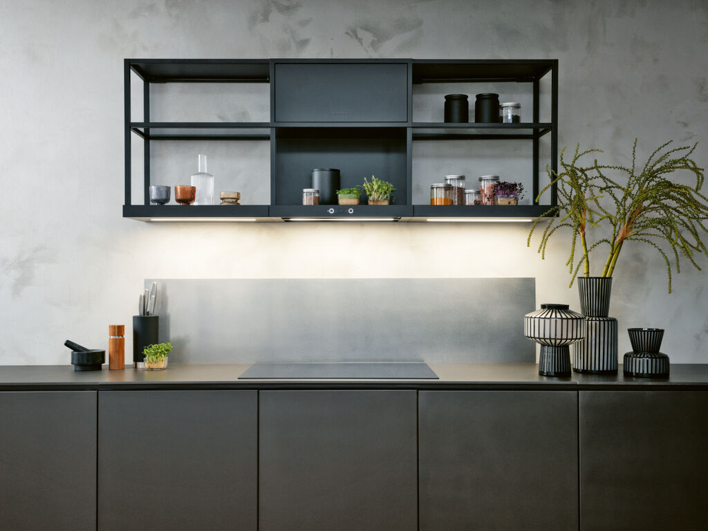 Smoke-grey glass shelves give the storage areas an open and light appearance. They are also a deliberate contrast with the matt-black surface of the hood. The matt black of the uniform, non-reflective surface is reminiscent of classic industrial design, and black has also been an interior design sensation in recent years. Opaque black pairs very well with the smoke grey of the glass shelves and serves as a distinctive design feature.