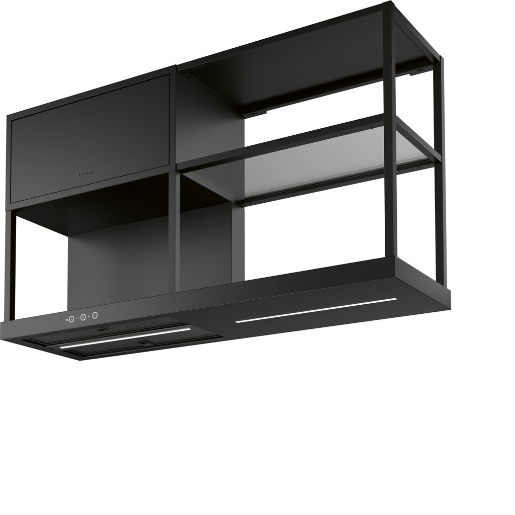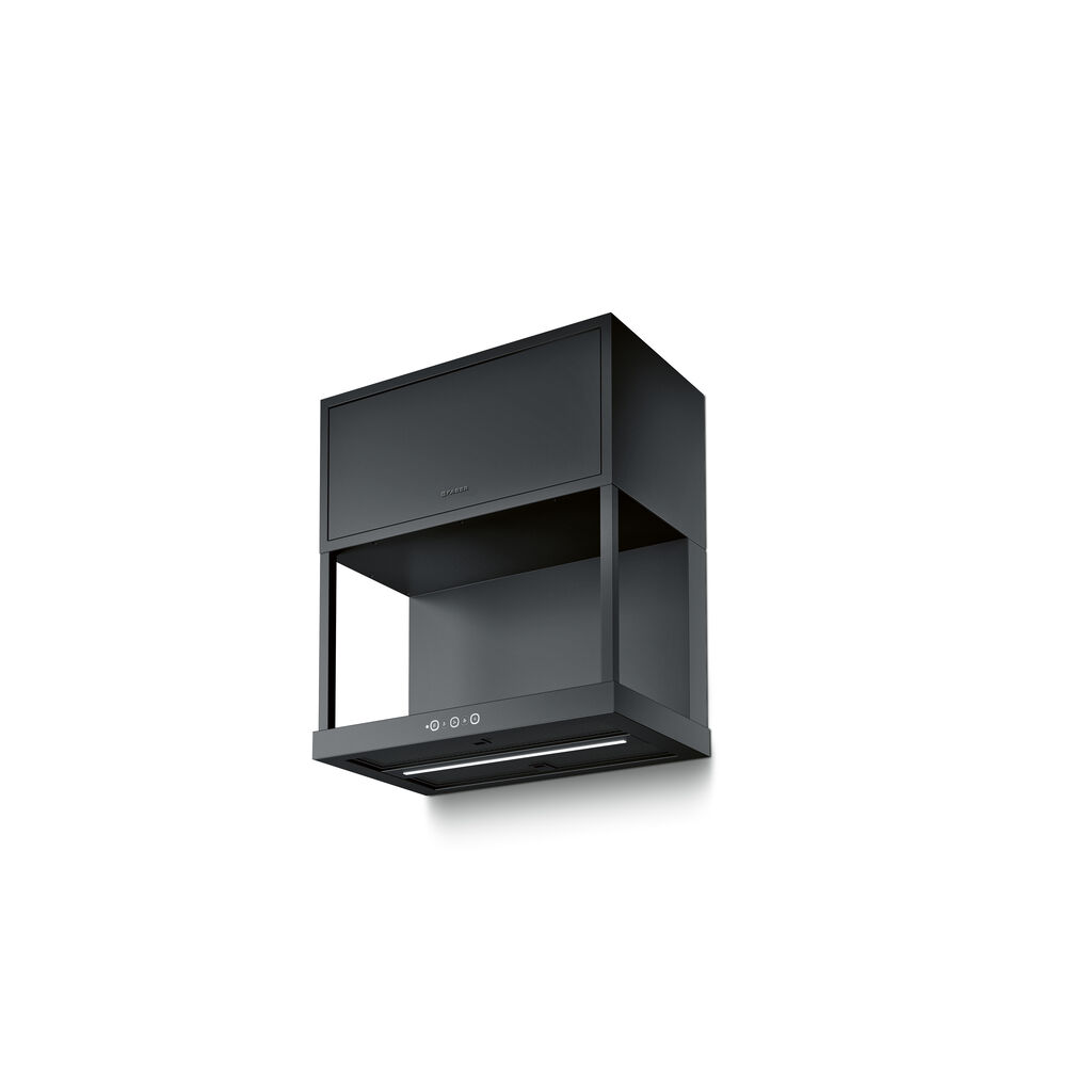 The motor is housed in the upper part of the appliance, meaning that the central area can be used as storage space – which in turn can be extended with up to two additional modules. The controls are located in the lower area, flush with the surface, which gives the overall look an element of neatness. A narrow LED light strip positioned in the centre of the lower section of the hood illuminates the work surface and creates a pleasant lighting mood. Modular is also flexibly configurable. It can be used as a stand-alone unit or in conjunction with modules on either side. Meticulous attention to detail has produced an overall result that is as functional as it is aesthetic.