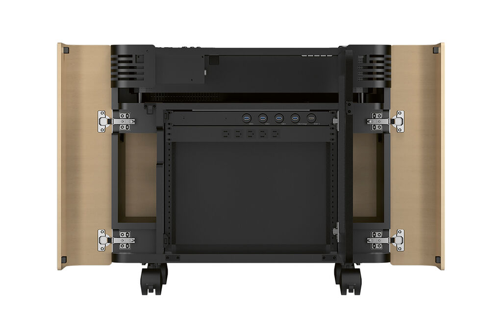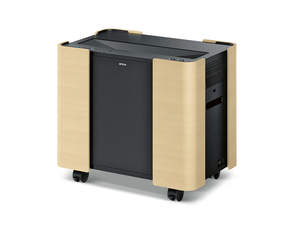 The interior-like character was a very important design goal. The envisioned use scenarios include corporate offices and educational environments. We had to achieve a high degree of balance between the functionality of mobility – the ability to move the projector and speaker – and the elegant presence that the product should have in its intended location. The wood grain panels were chosen both to protect the main unit and to fulfil the requirements for a living room-friendly aesthetic.