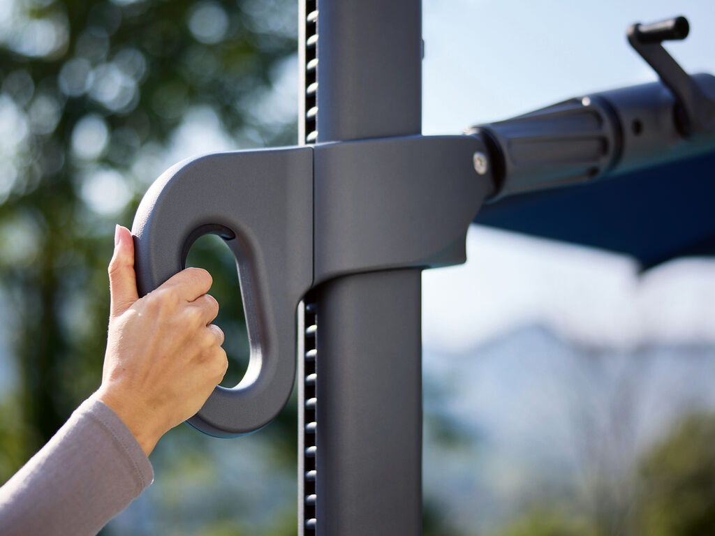 The rotating grip on the arm of the parasol for adjusting horizontal tilt is my favourite. It’s incredibly intuitive; you know immediately how it works. It also seamlessly blends into the overall design and emphasises the minimalist aesthetic. The base is certainly the most useful feature. It solves common problems and is retailed in the same box as the parasol to save on packaging, transport costs and emissions. Both details are based on simple concepts, yet they are genuine game changers.