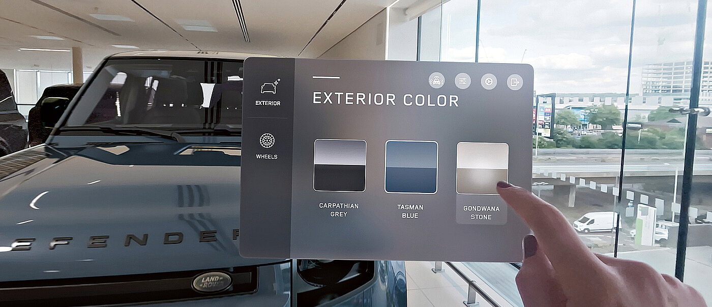 We wanted to make the digital product experience as real as possible. Customers can configure the Defender to their preferences using highly intuitive interactions. We placed the user interface in the palm of the user’s hand. That way it feels personal and is always there when they need it without obstructing the view of the vehicle. Future versions will feature voice control in combination with finely tuned AI product knowledge. For example, if a user says, “I like to ski”, then a roof rack and winter tires will be added; or related accessories, such as snow chains, will be suggested. In addition, multiple users will be able to participate simultaneously in the experience.