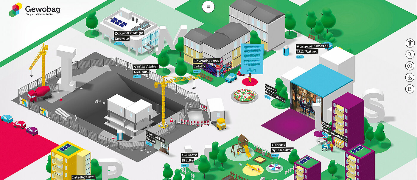 Deeply rooted in 3D visualisation, the Essen-based agency for design and communication heureka has been making complex content visually understandable and tangible since 1990, when digital rendering was still uncharted territory. Even today, the passion for captivating storytelling remains unbroken among the now 18 employees. Calling themselves “Fluid Thinkers”, they use technology, design and surprising approaches to bring content to life. “We like to try out new things, to think outside the box with wild combinations – and we all have one thing in common: having fun with creative ideas!” True to this motto, heureka created an extraordinary digital annual and sustainability report for Gewobag, one of Germany’s largest property companies. Designed to be playful and technically sophisticated, the immersive 3D experience draws the user right into the heart of the company and conveys its values, goals and figures in a vivid way. Smooth navigation on various devices and simple operation contribute to the fun of discovery, as does the charming, vivid environment. Film and photographic elements create exciting contrasts and round off the image of a company that is characterised by customer proximity, innovative strength, foresight and creativity. In this way, the report becomes an interactive experience that is focused on narrative, aesthetics, atmosphere and technology across the board.