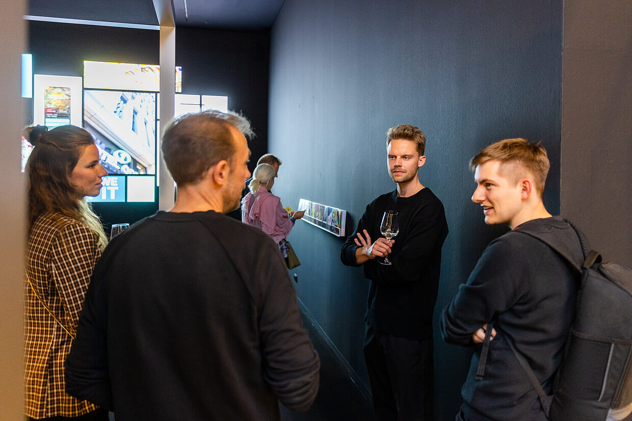 The opening of the exhibition took place on the evening of 7 April. Professor Dr. Peter Zec welcomed the guests and introduced the vernissage with a video selection of awarded communication design. Among the guests were several winners of the Red dot Award: Communication Design 2021 as well as the denkwerk team.